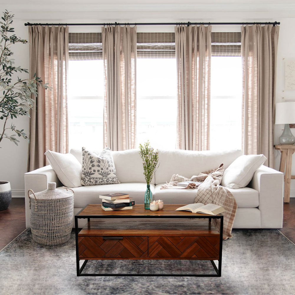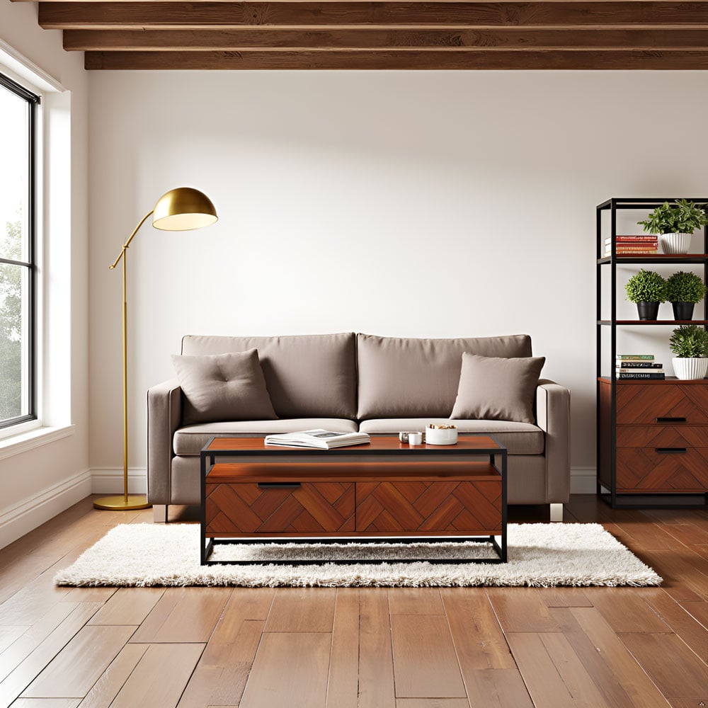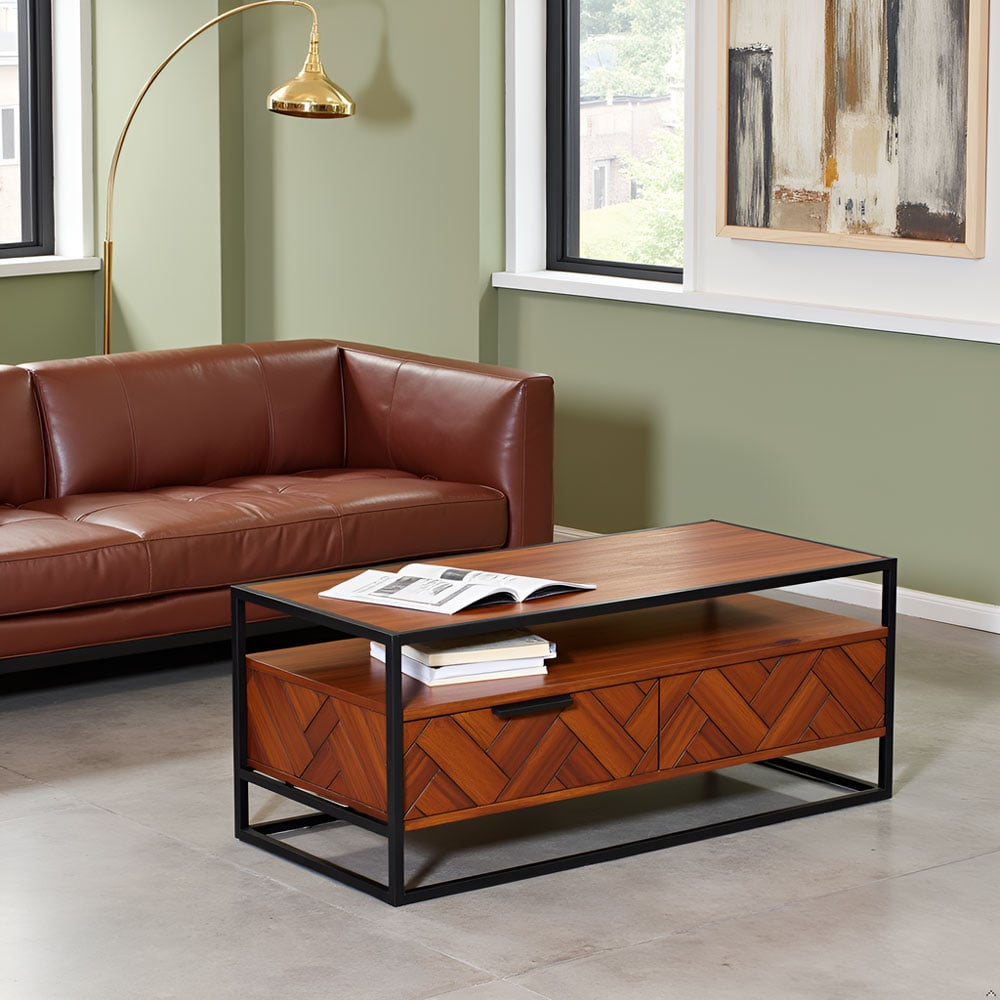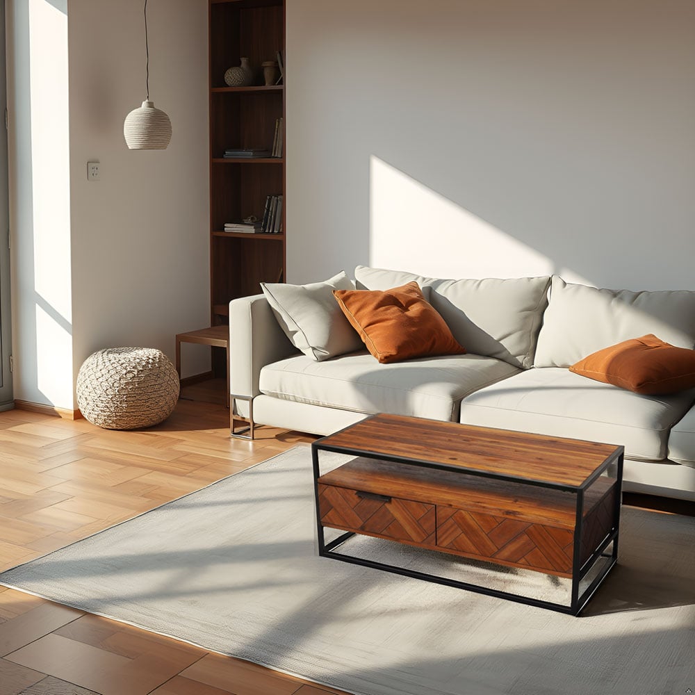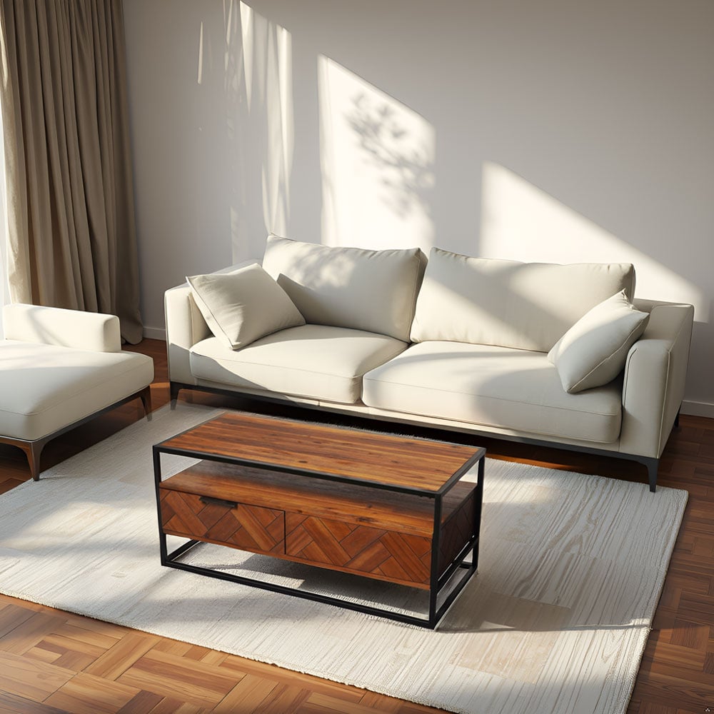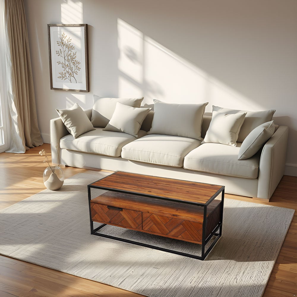 Acacia Wood Coffee Table with 2 Drawers & Powder-Coated Steel Frame