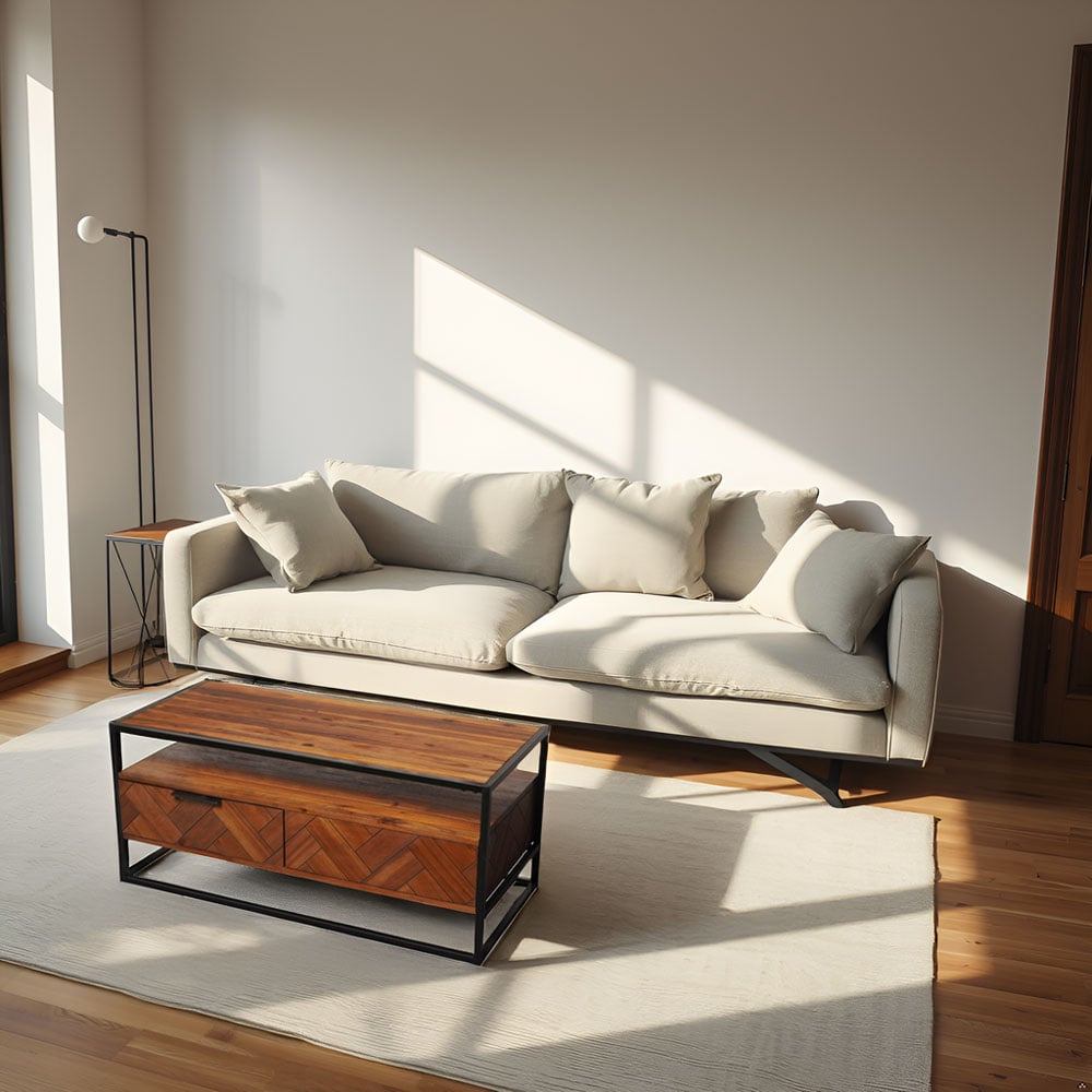 Bring warmth, function, and modern character into your living space with this beautifully crafted acacia wood coffee table. Designed with a durable pine-veneer exterior and supported by a sturdy powder-coated steel frame, this table blends natural texture with industrial elegance for a timeless look that fits effortlessly into contemporary, rustic, or minimalist interiors.