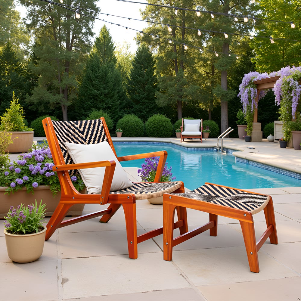 Create a calm and inviting outdoor retreat with this beautifully crafted patio lounge chair and matching footrest. Built from durable acacia wood and finished with hand-woven PE wicker, this set blends natural warmth with long-lasting outdoor performance. The ergonomic armchair design provides supportive comfort for extended relaxation, while the coordinating footrest allows you to fully stretch out and unwind.