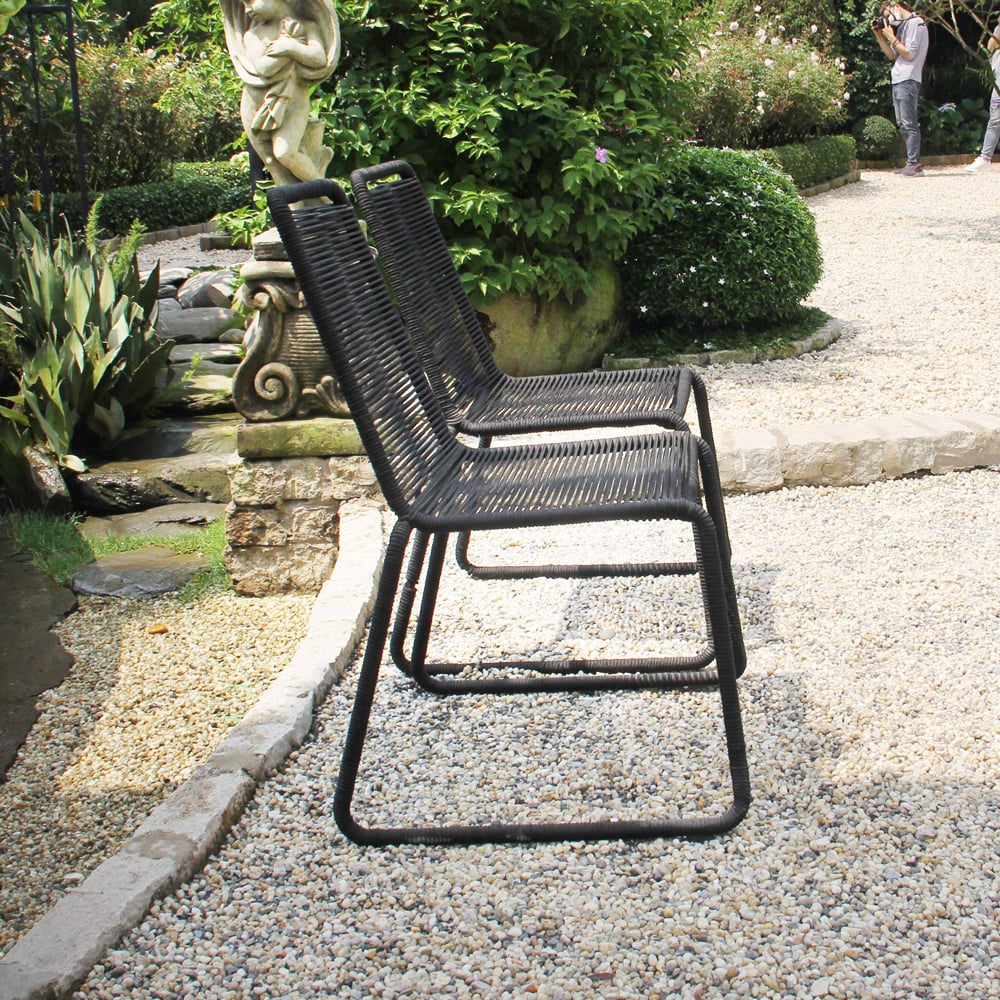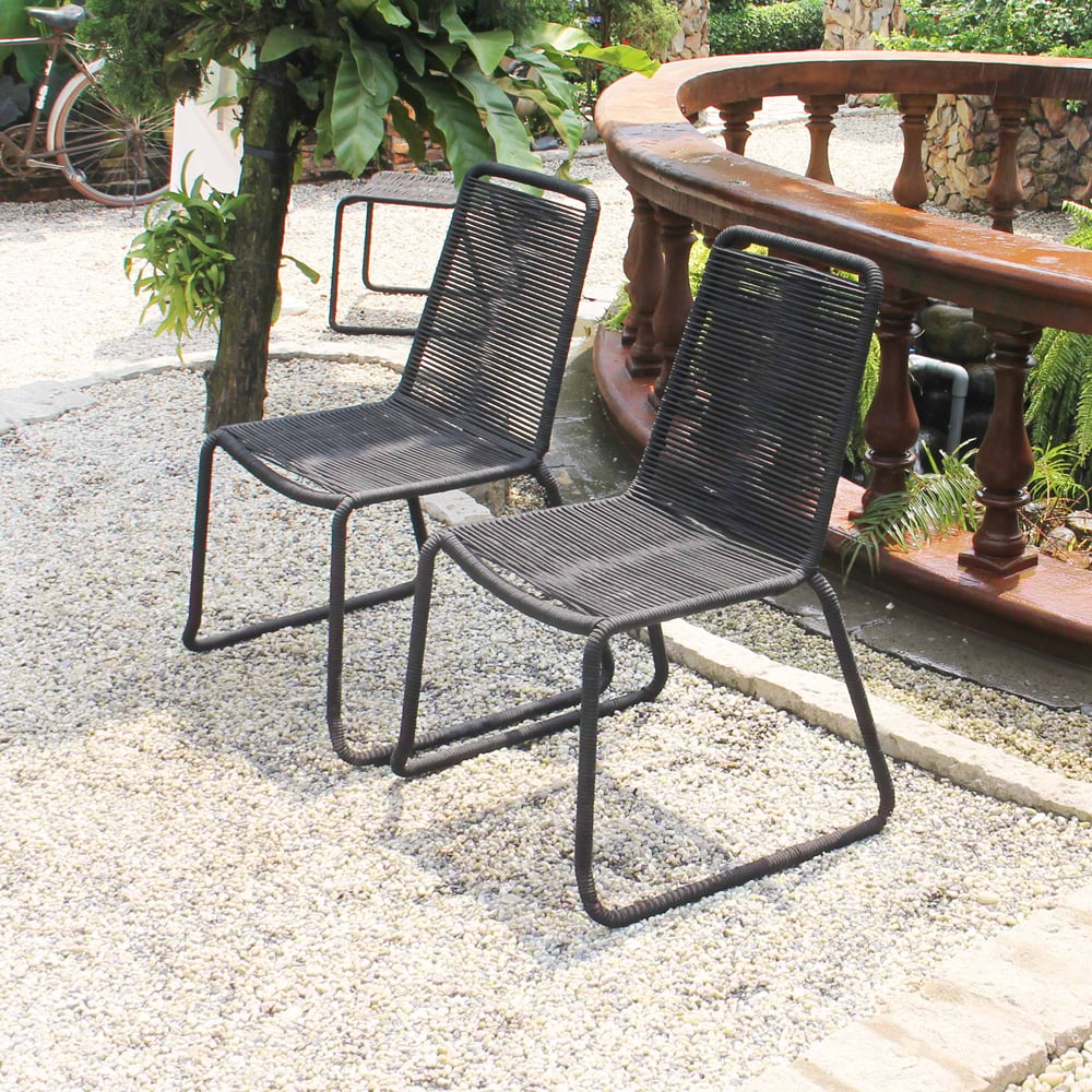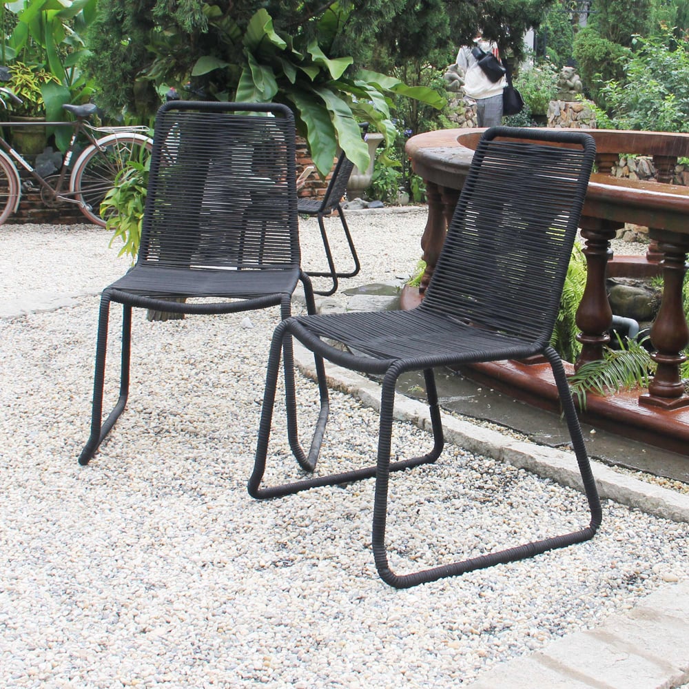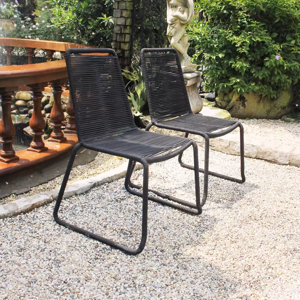 Bring modern simplicity and everyday durability to your outdoor space with this set of two black patio stacking chairs. Designed with a sturdy steel frame and wrapped in sleek rope weaving that extends seamlessly through the legs, these chairs deliver both visual elegance and reliable support for patios, balconies, gardens, or outdoor dining areas.