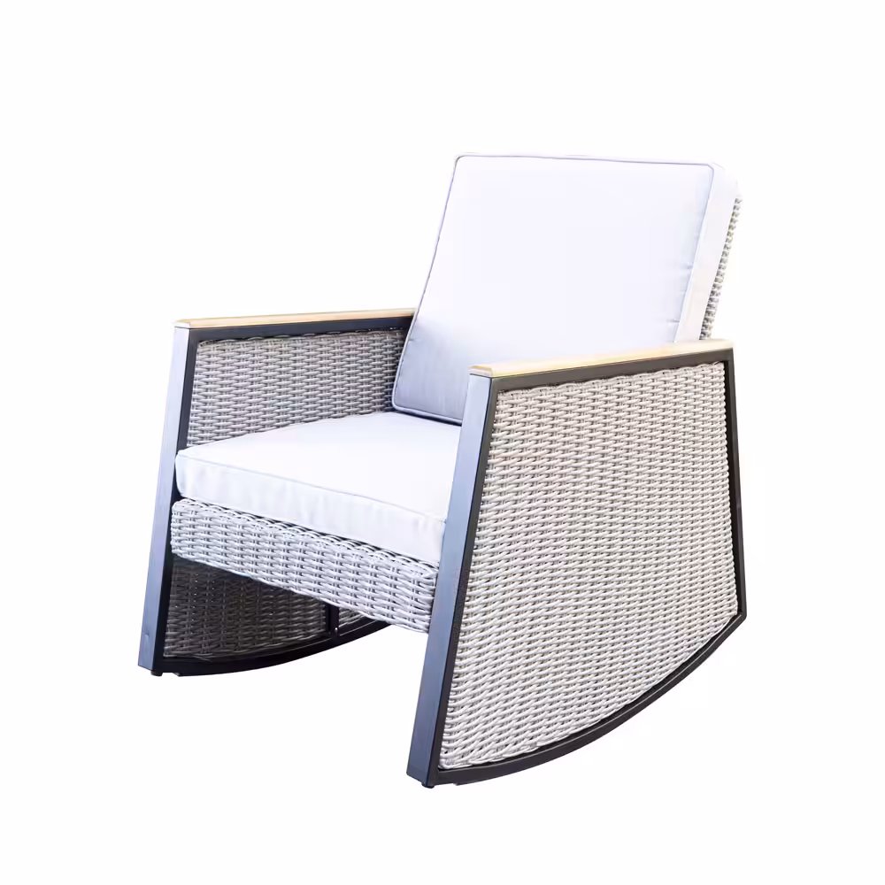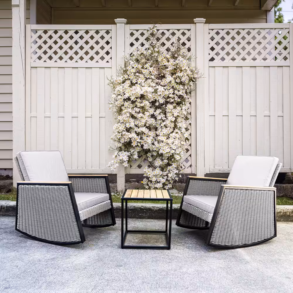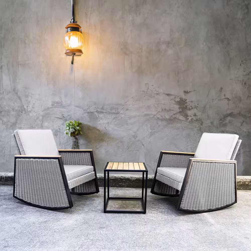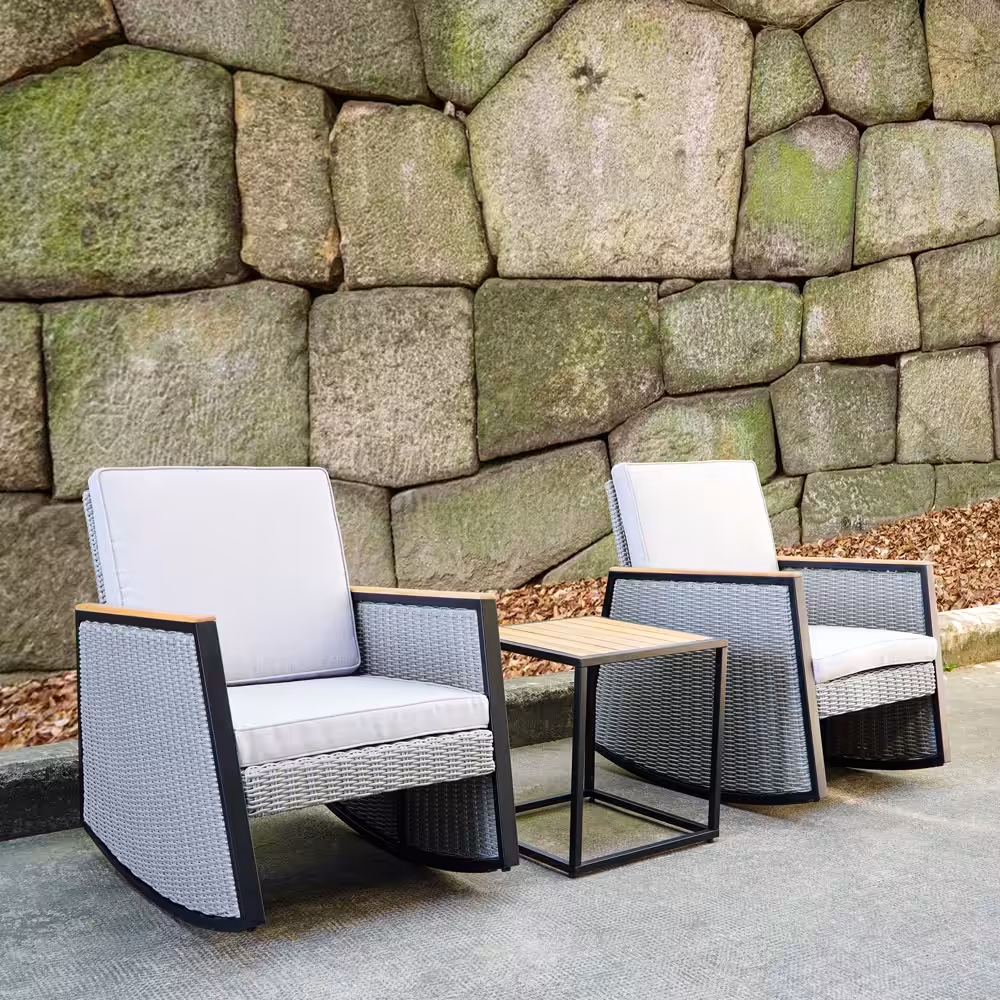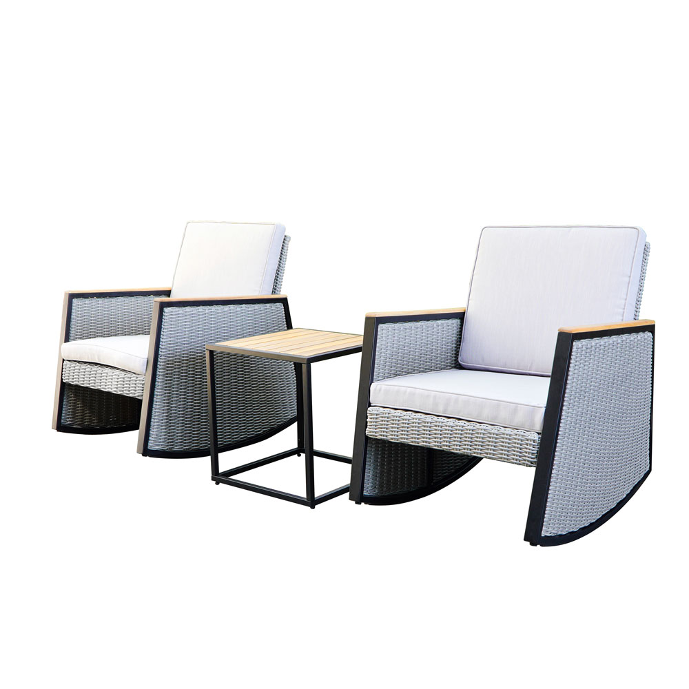 Grey Wicker Rocking Chair Patio Bistro Set with Acacia Side Table – Compact Outdoor Seating