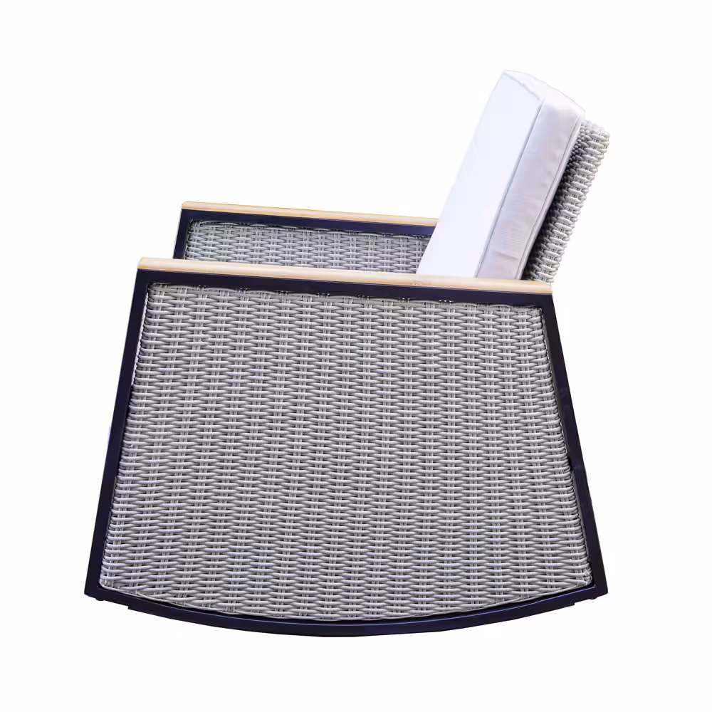 The refined blend of black powder-coated steel, soft grey half-round wicker weaving, and warm brown acacia wood accents creates a balanced modern look that complements balconies, patios, garden paths, or cozy indoor-outdoor corners.