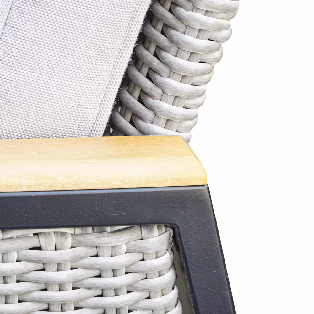 Grey half-round wicker weaving with acacia wood arm panels