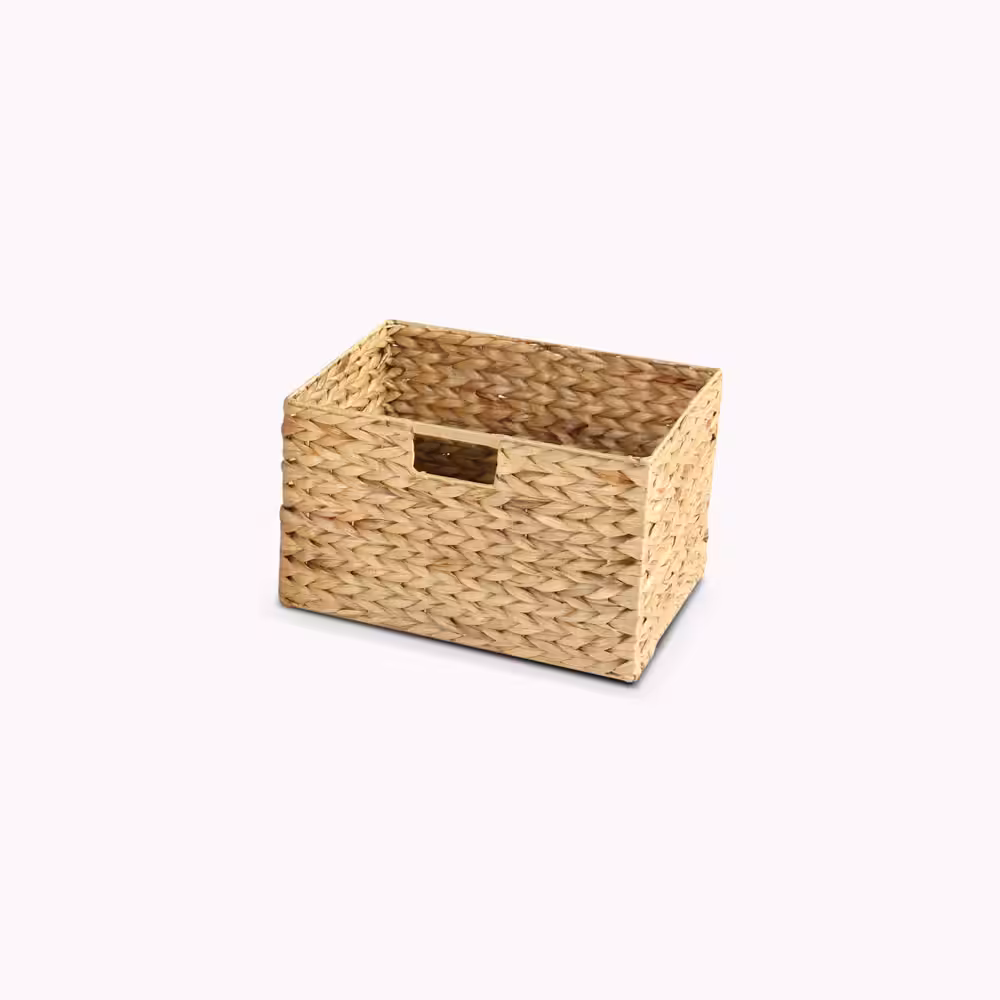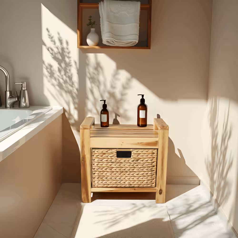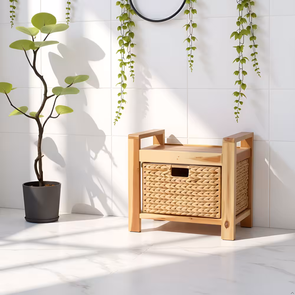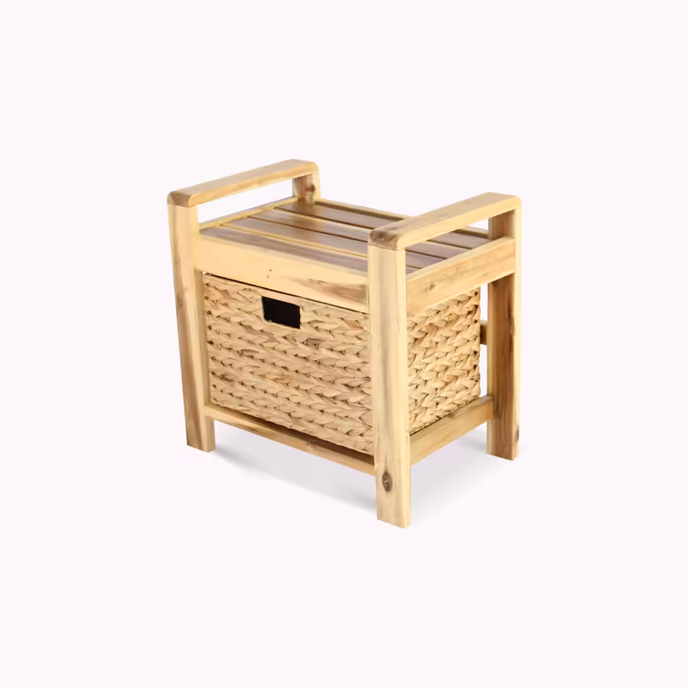 Handmade Acacia Wood Storage Stool with Water Hyacinth Basket – Natural Accent Organizer