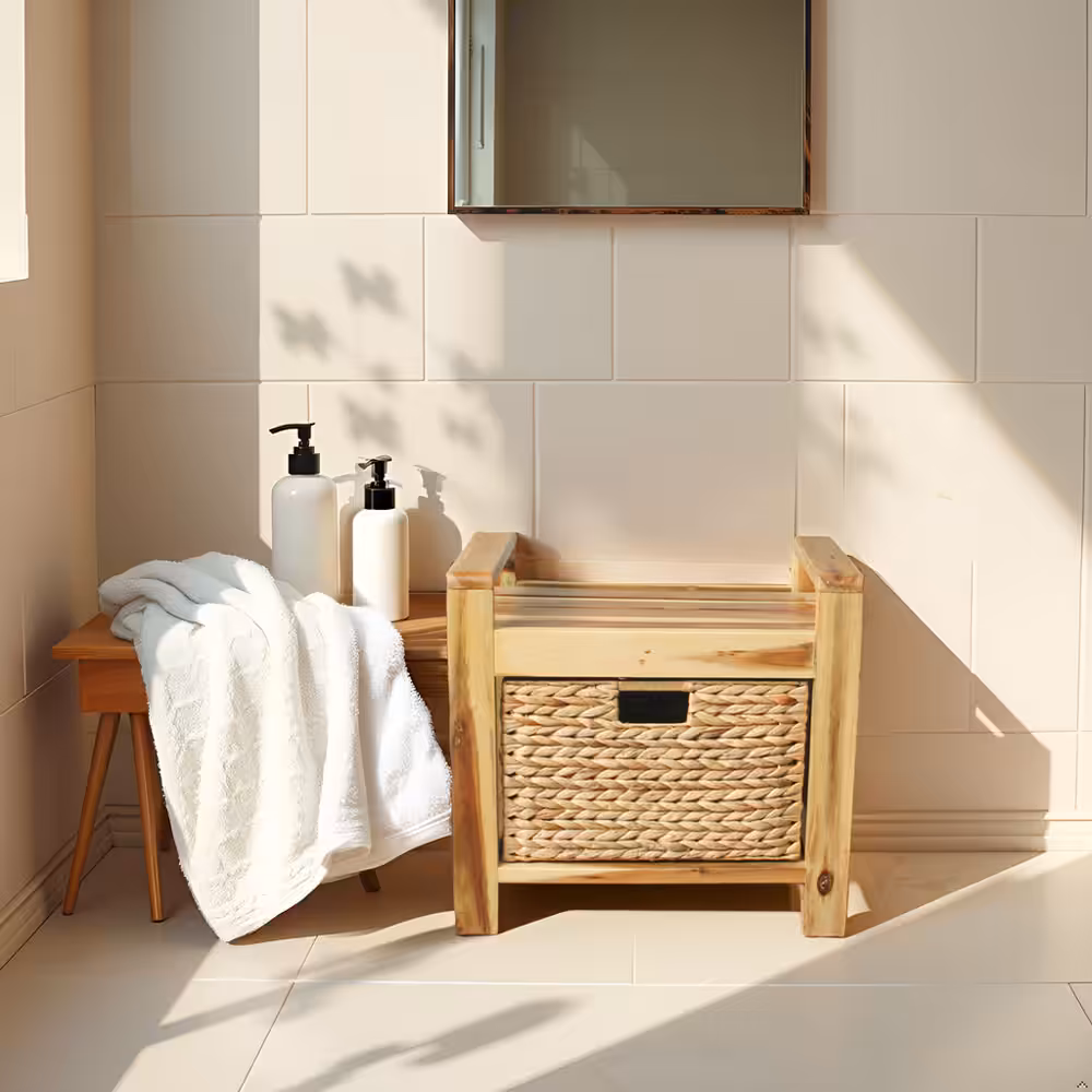 Designed for both seating and organization, this compact accent piece works perfectly in entryways, bedrooms, living rooms, or covered outdoor spaces. The removable woven basket provides convenient hidden storage for blankets, toys, magazines, or everyday essentials while maintaining a clean, minimalist look.