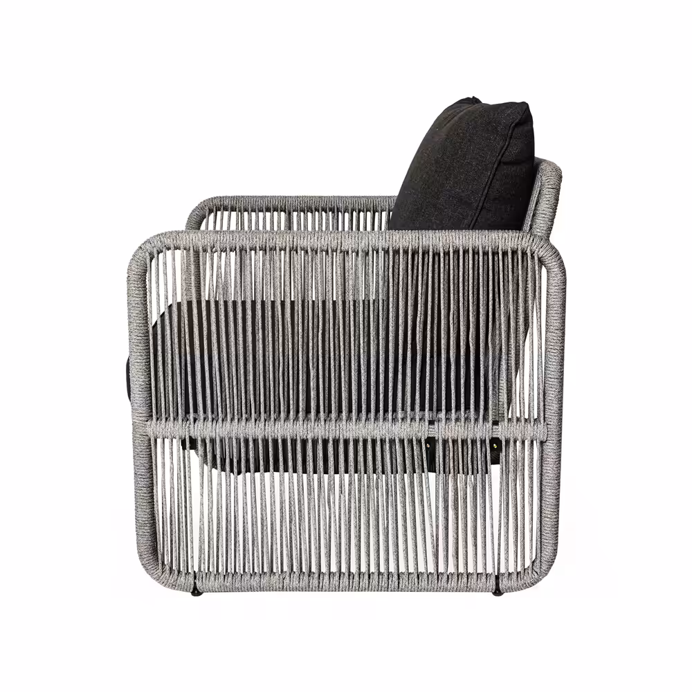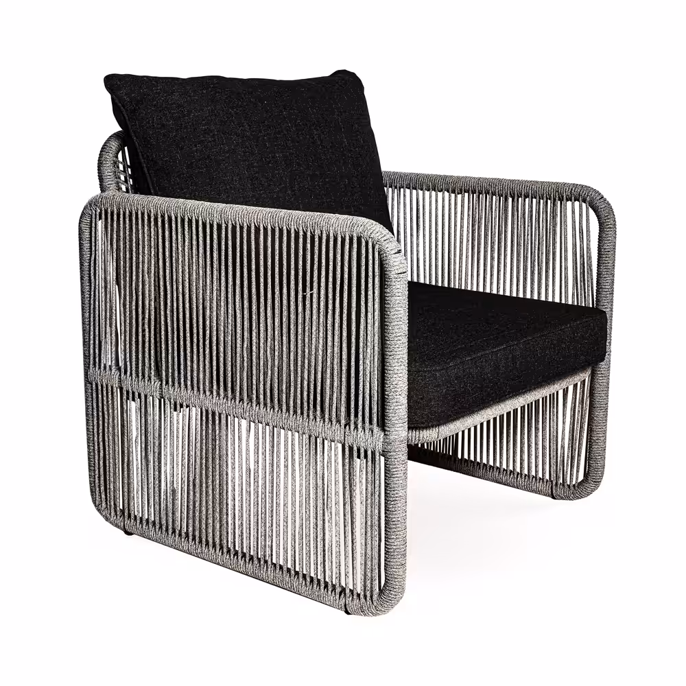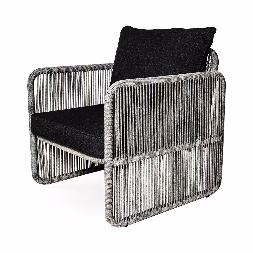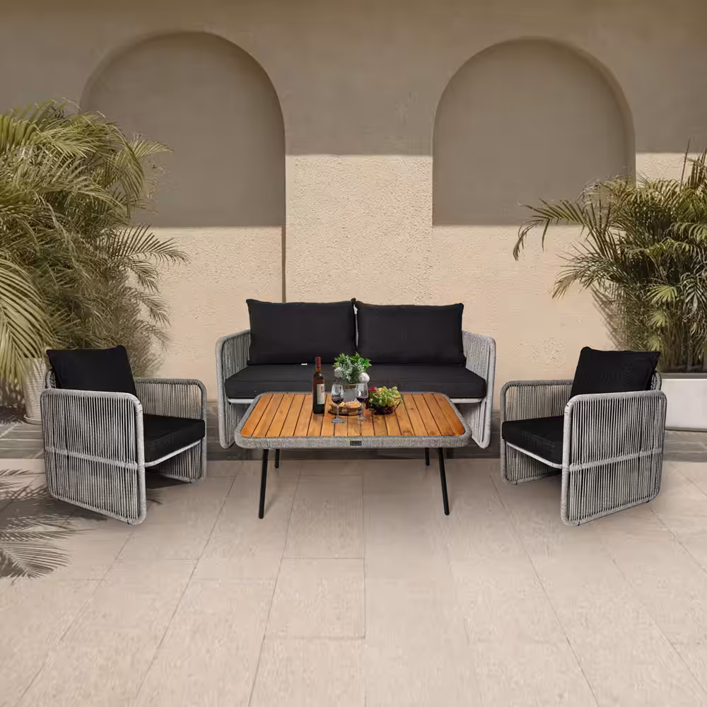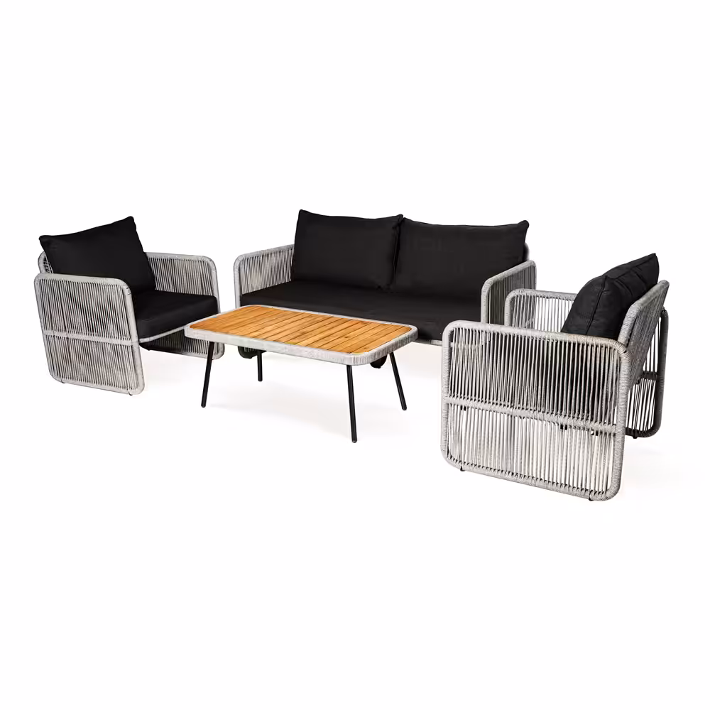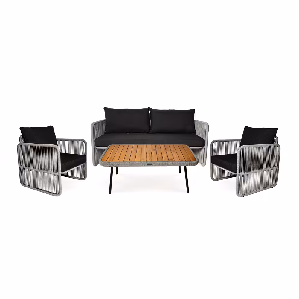 The refined pairing of black powder-coated steel, light grey rope weaving, and warm brown acacia wood brings a soft, architectural look that complements patios, balconies, gardens, and poolside spaces alike.