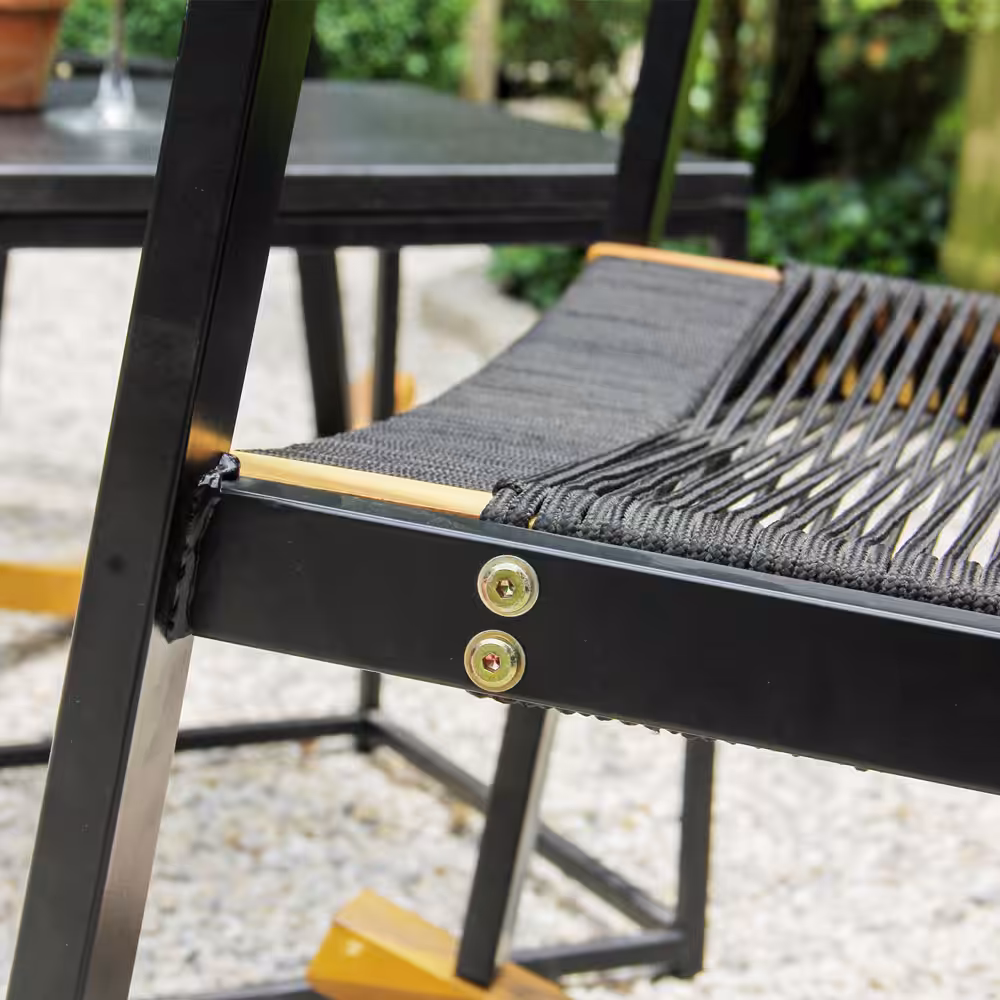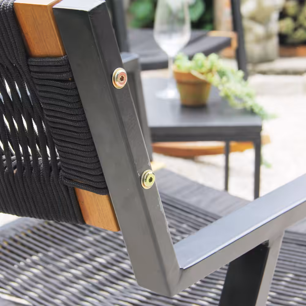 The combination of black powder-coated steel, hand-woven round rope detailing, and warm brown acacia wood creates a refined look that feels contemporary yet naturally welcoming—perfect for patios, balconies, gardens, or quiet courtyard spaces.