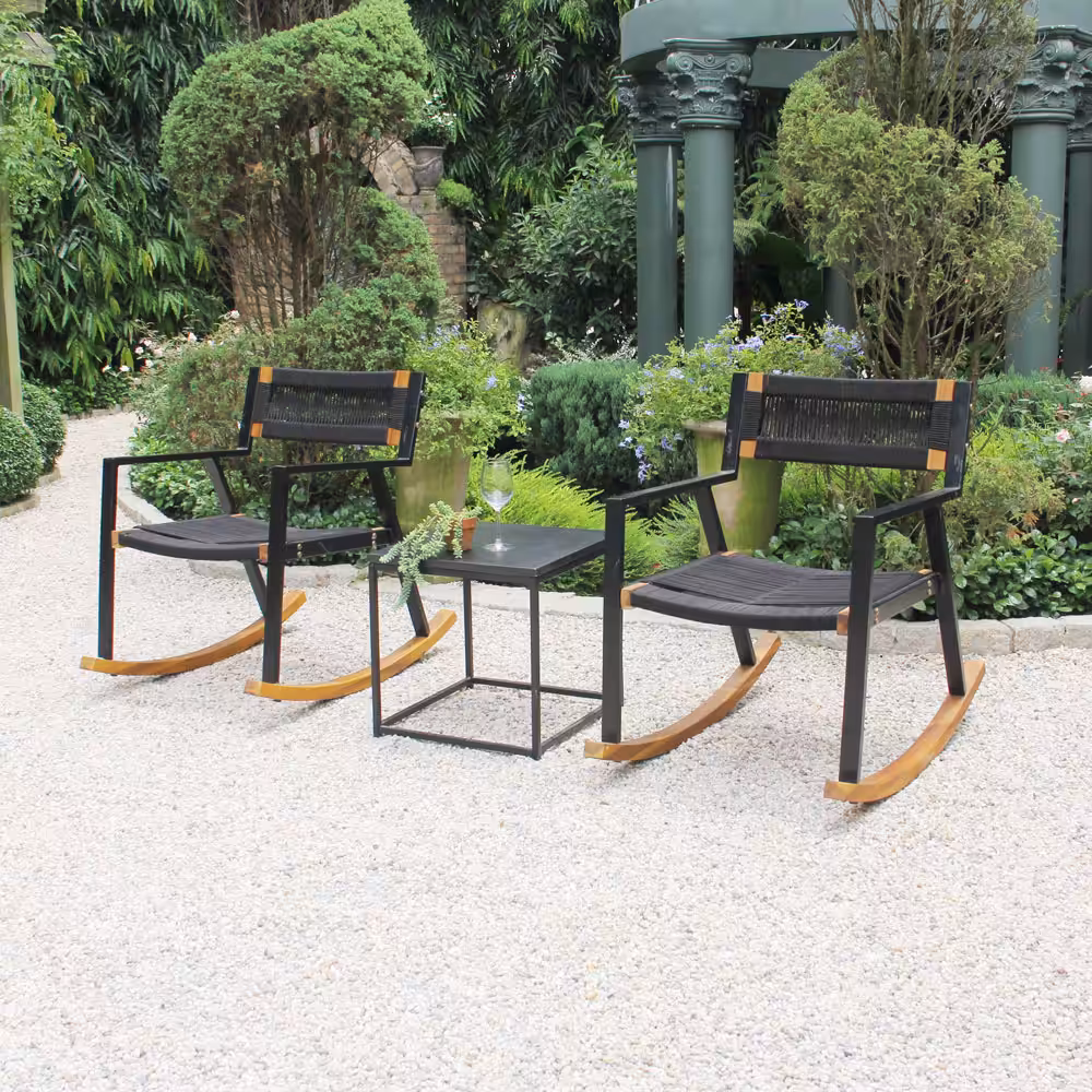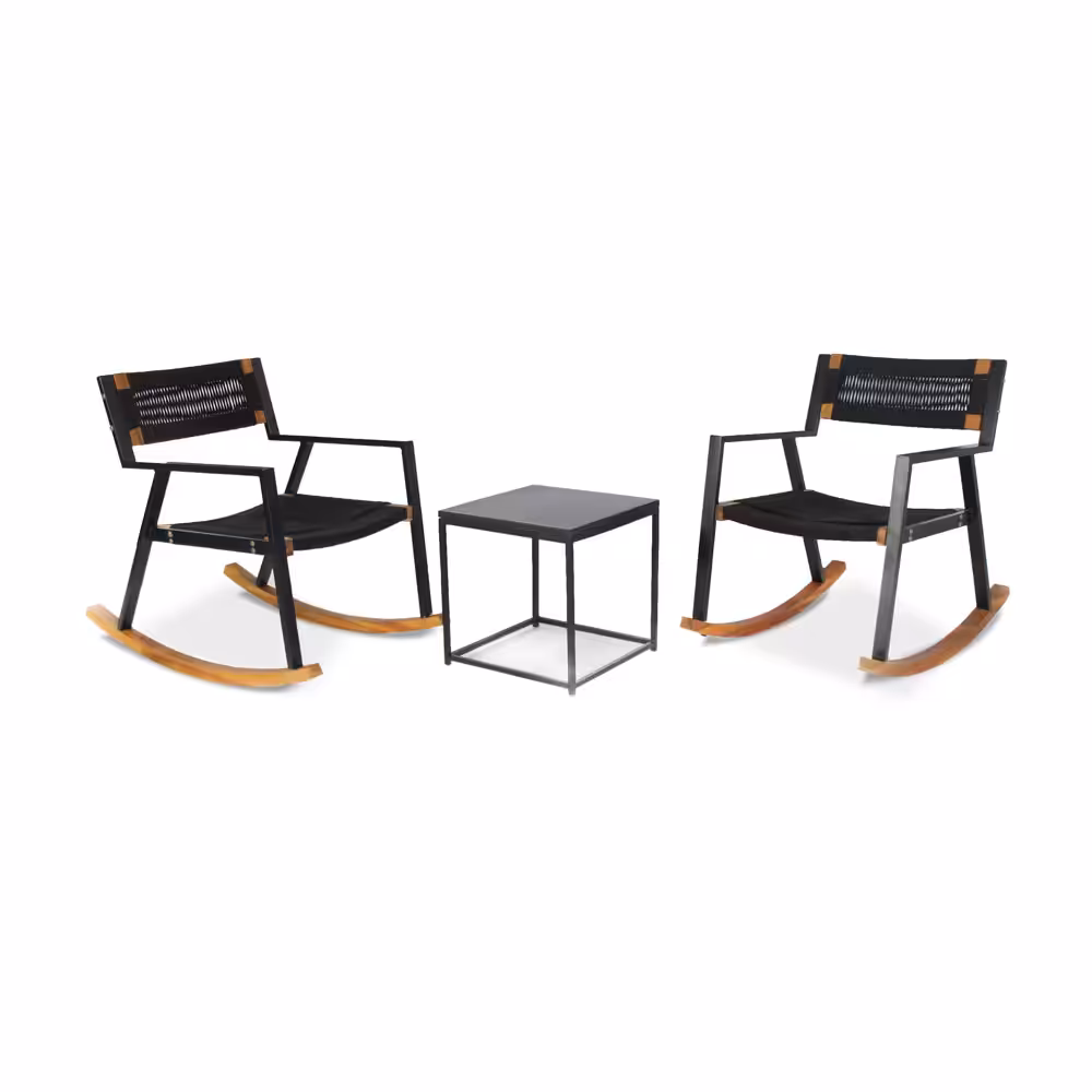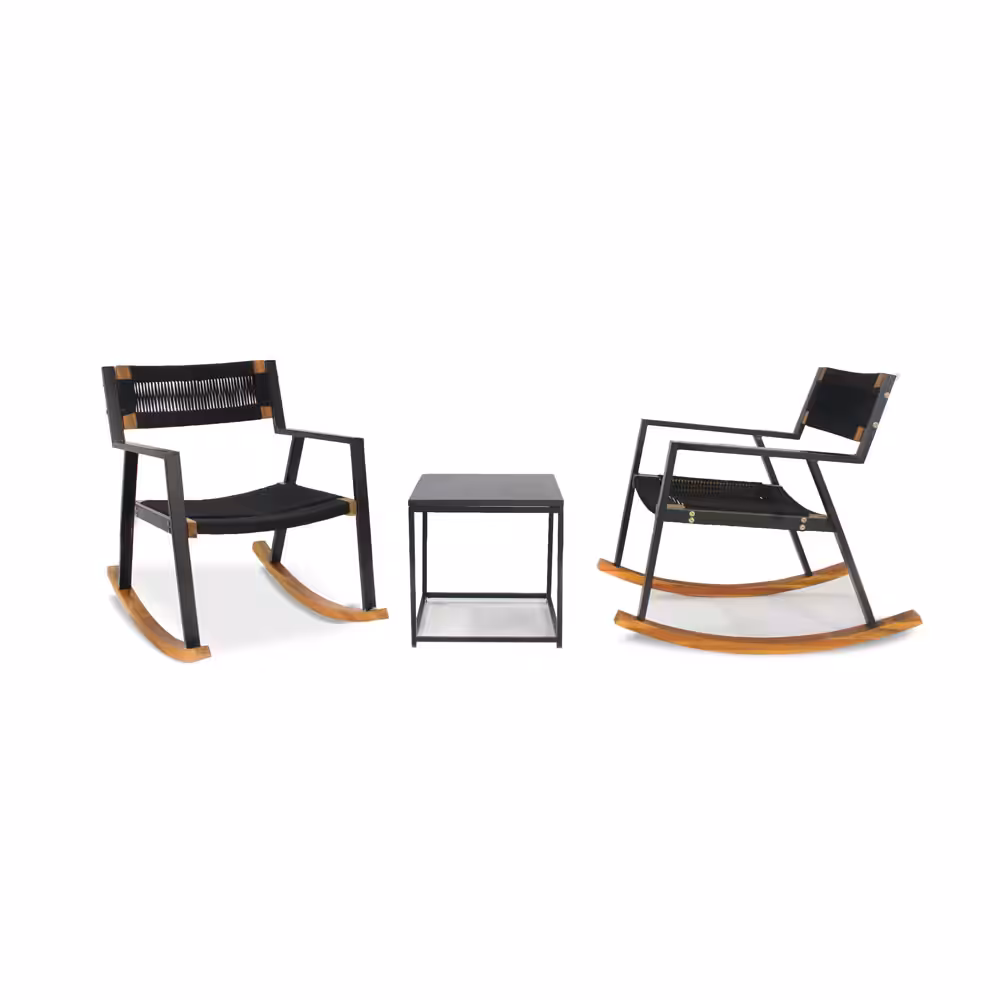 The balanced combination of clean steel framing, hand-woven rope seating, and acacia wood rocking legs delivers a contemporary look while maintaining a welcoming, organic feel—perfect for balconies, small patios, garden corners, or cozy courtyard settings.