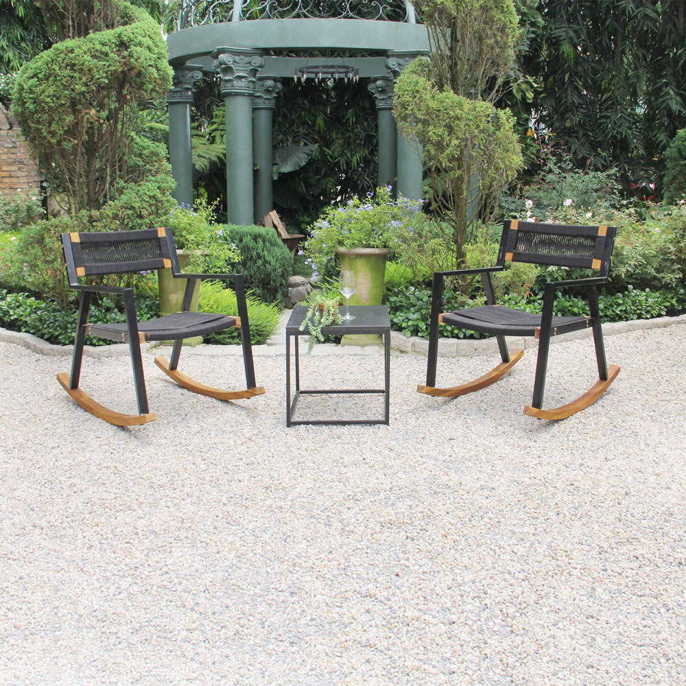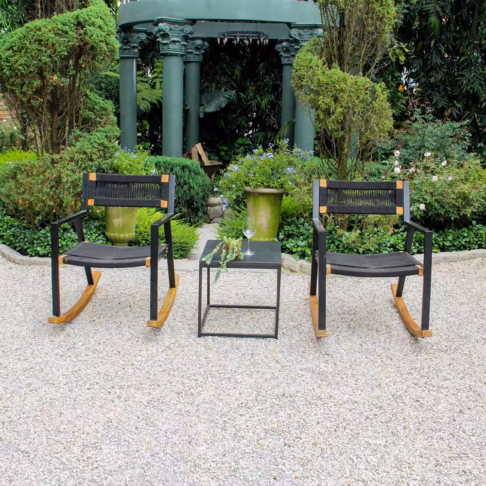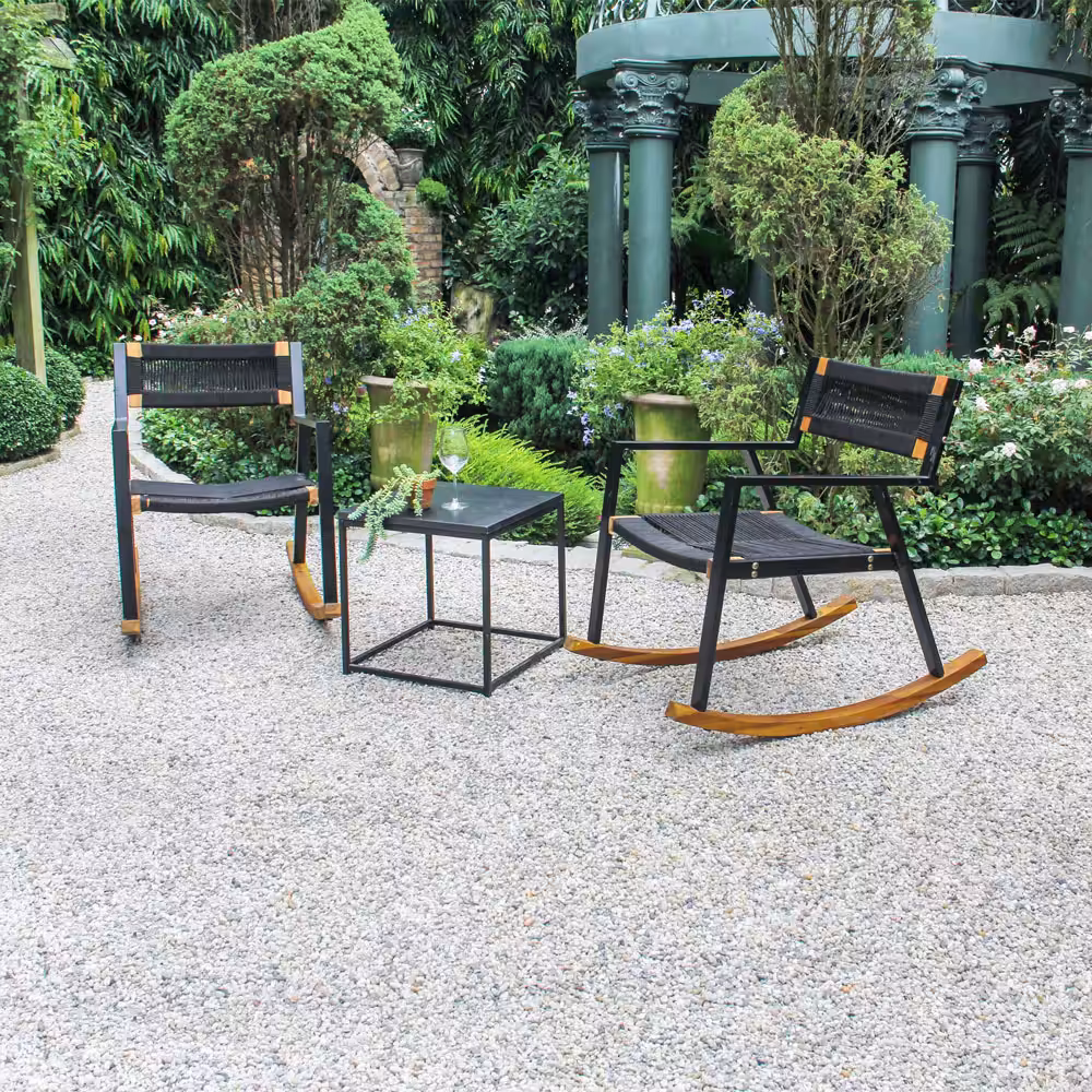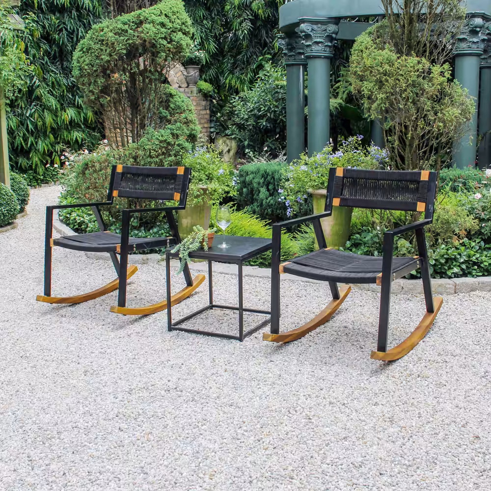 The balanced combination of clean steel framing, hand-woven rope seating, and acacia wood rocking legs delivers a contemporary look while maintaining a welcoming, organic feel—perfect for balconies, small patios, garden corners, or cozy courtyard settings.