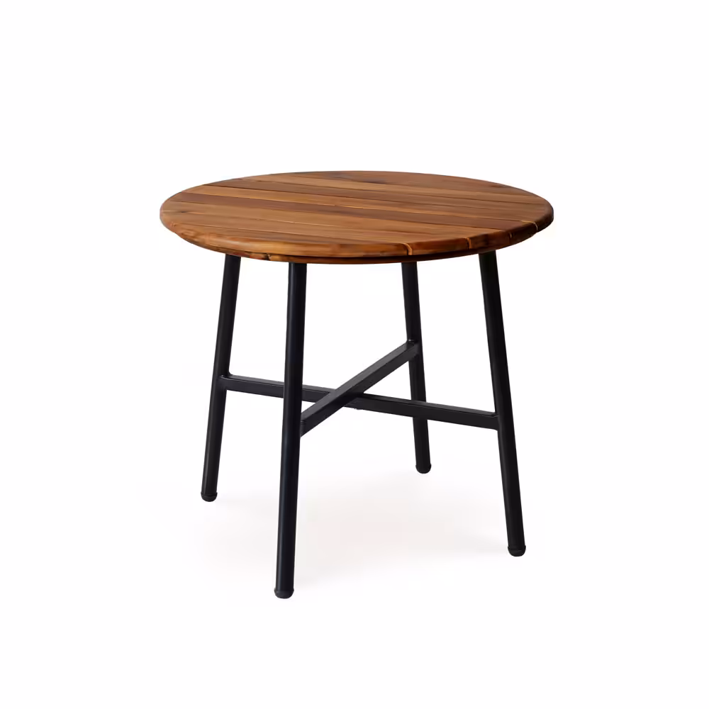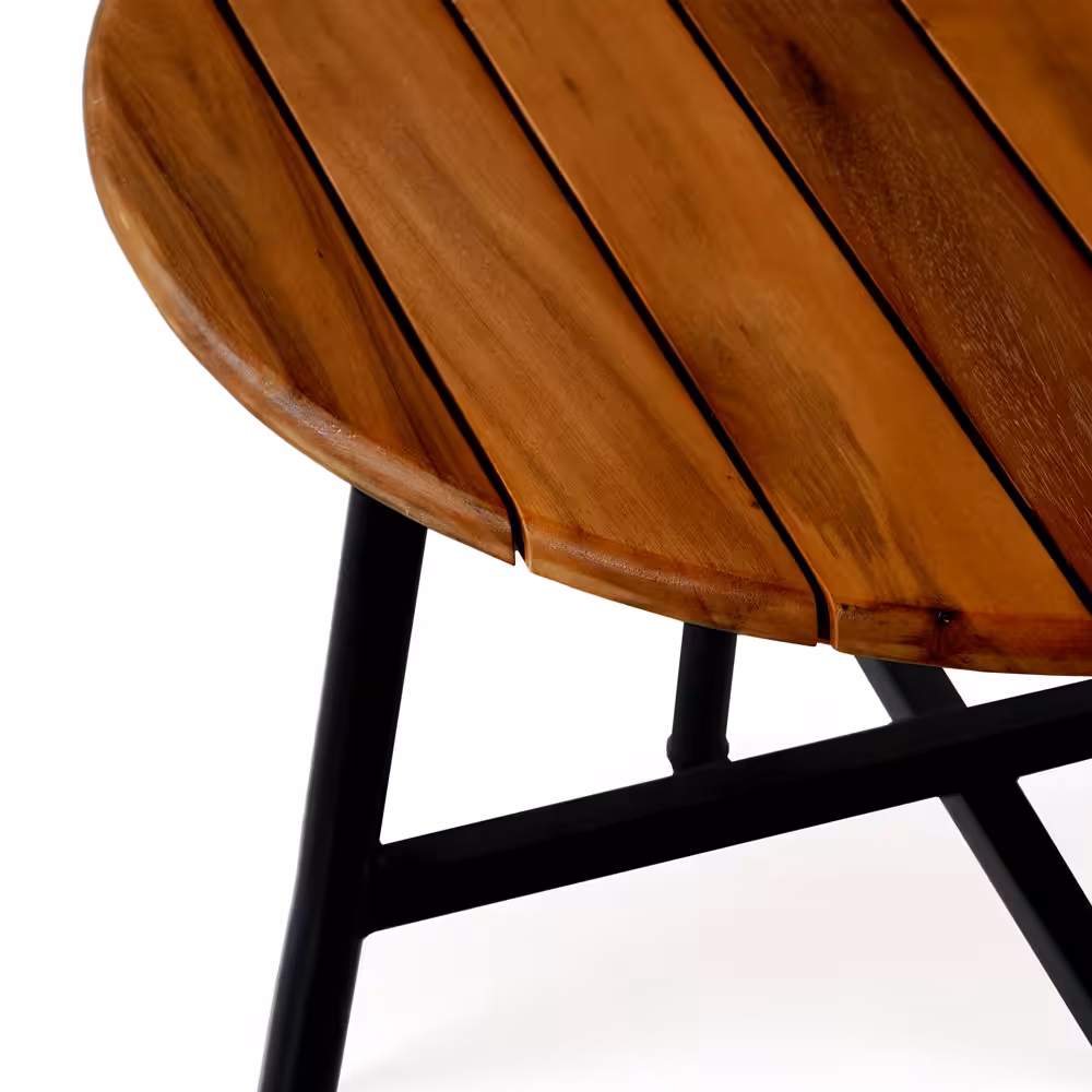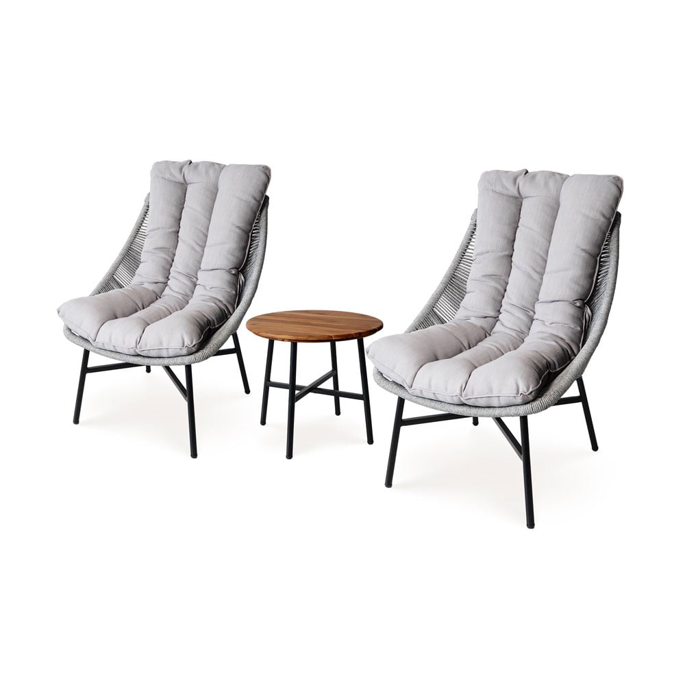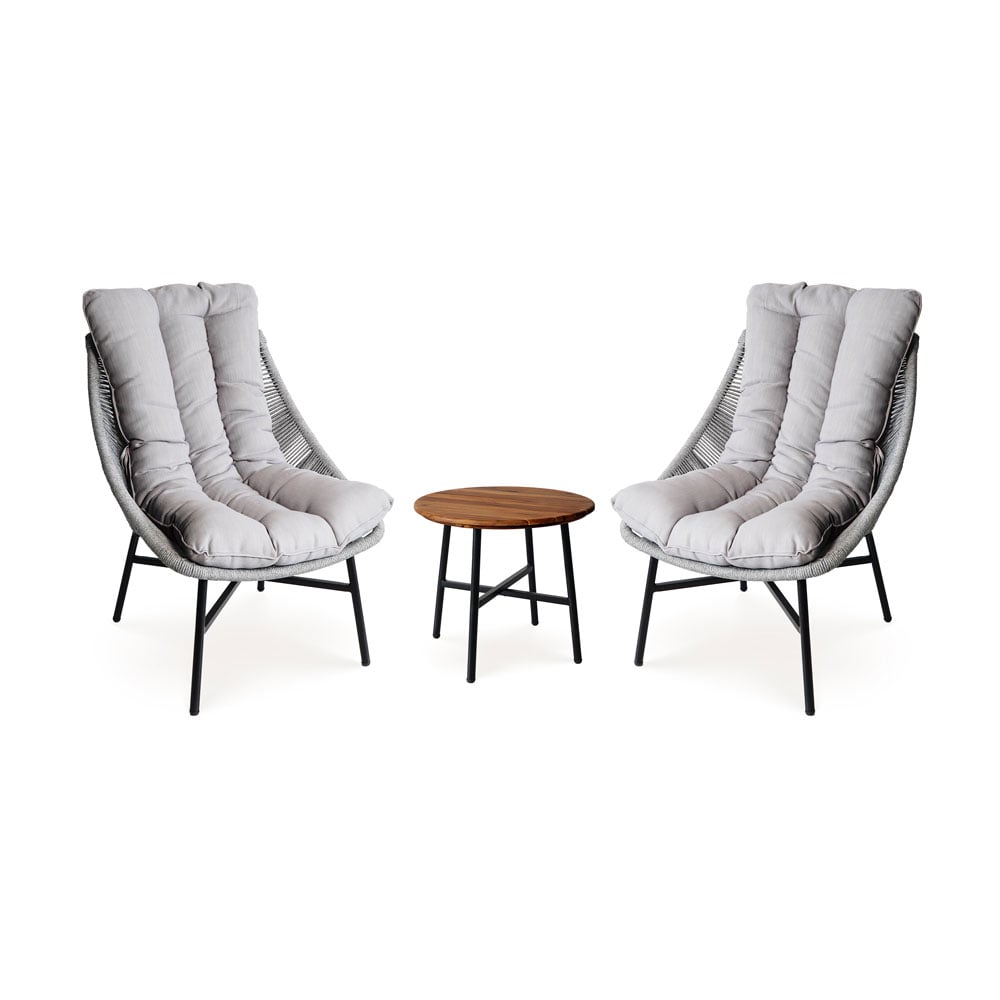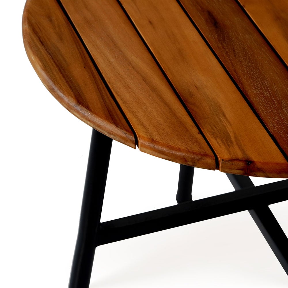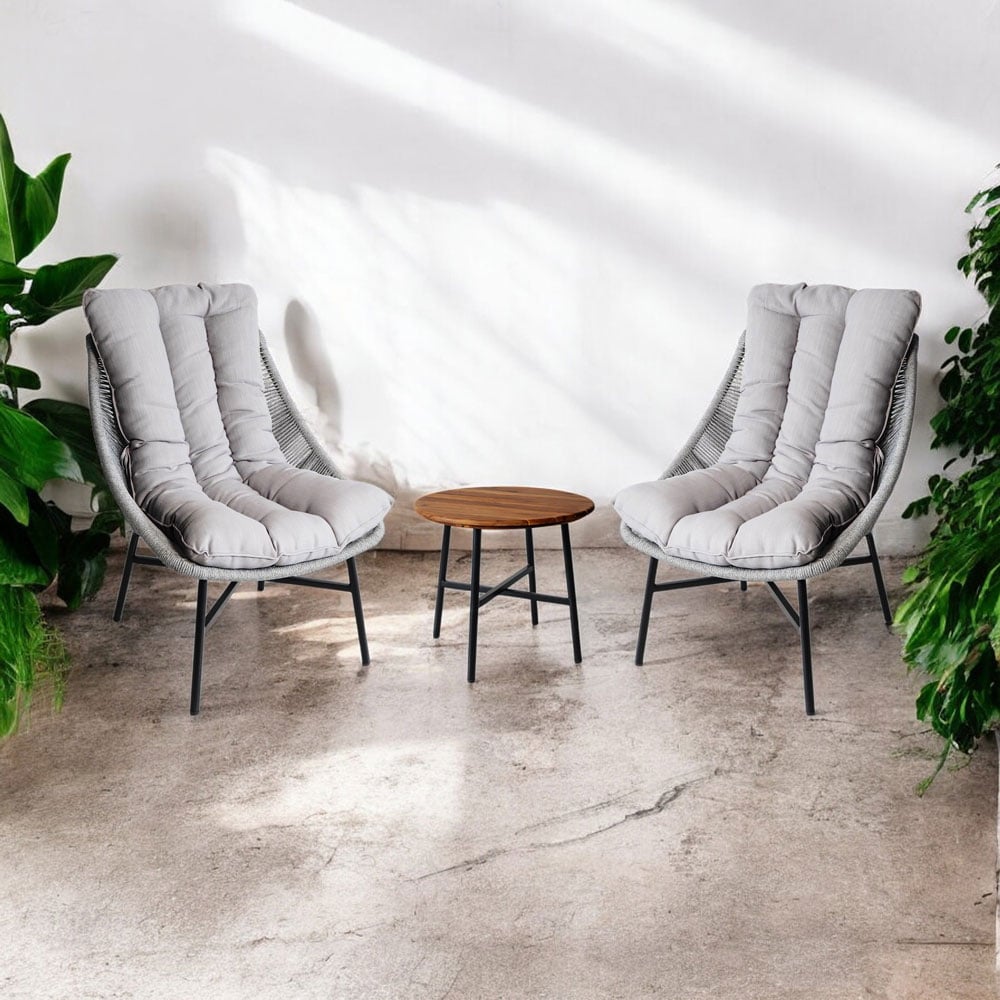 The matching side table features a sleek steel frame paired with a warm brown acacia wood tabletop, offering a natural contrast that complements the modern seating design. Ideal for morning coffee, evening drinks, or casual conversation, this set delivers both comfort and refined outdoor style.
