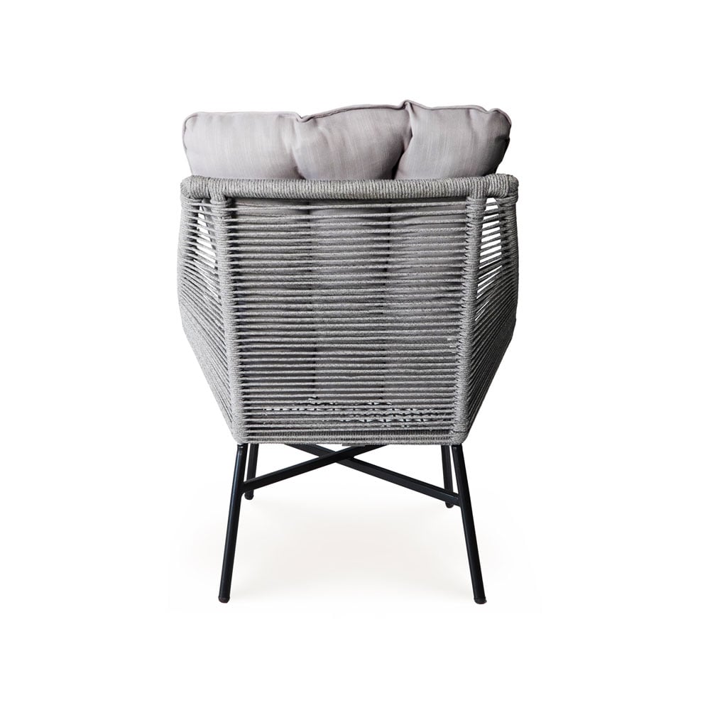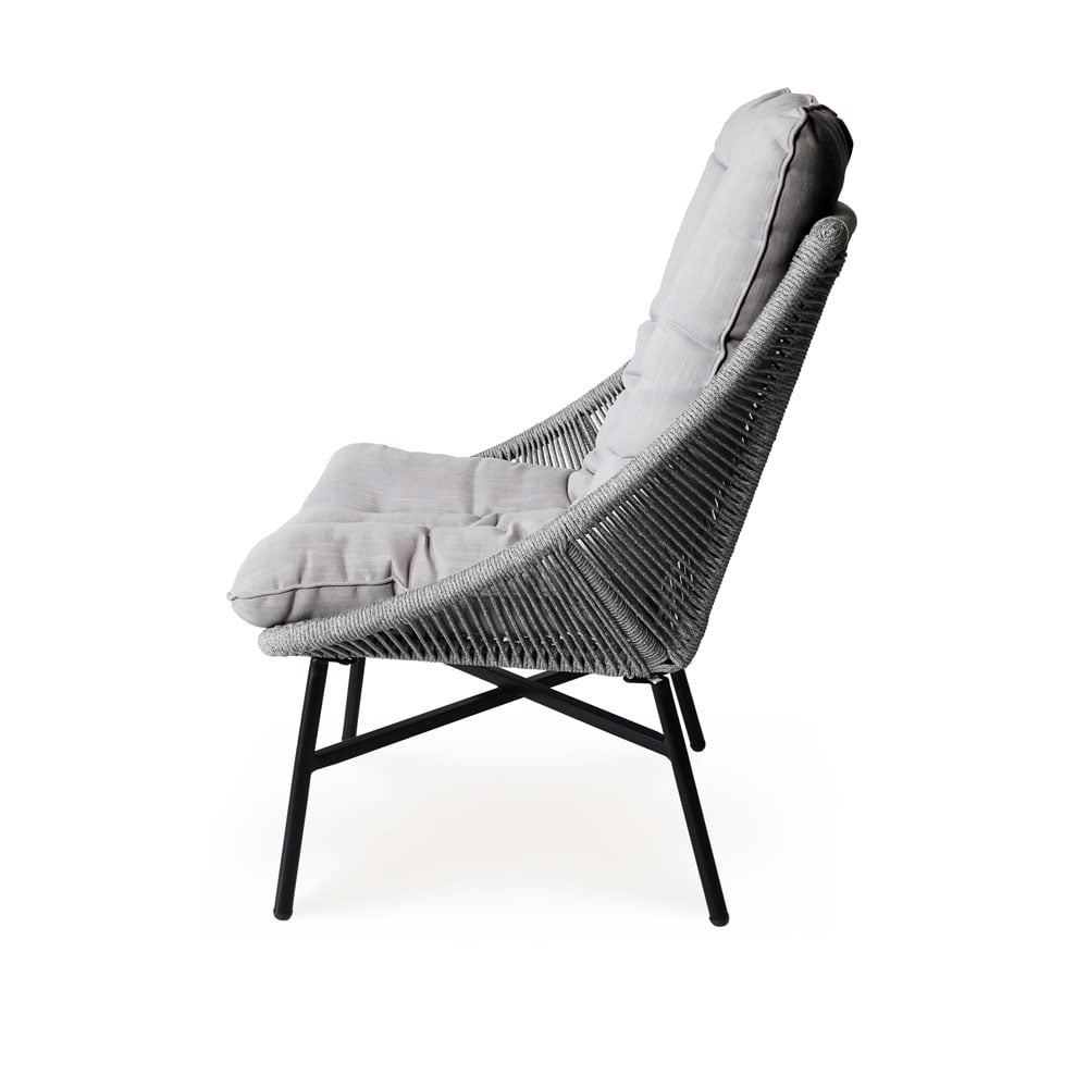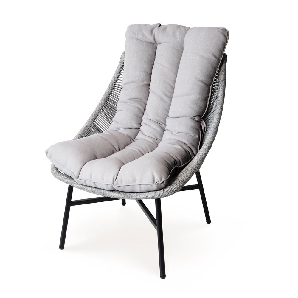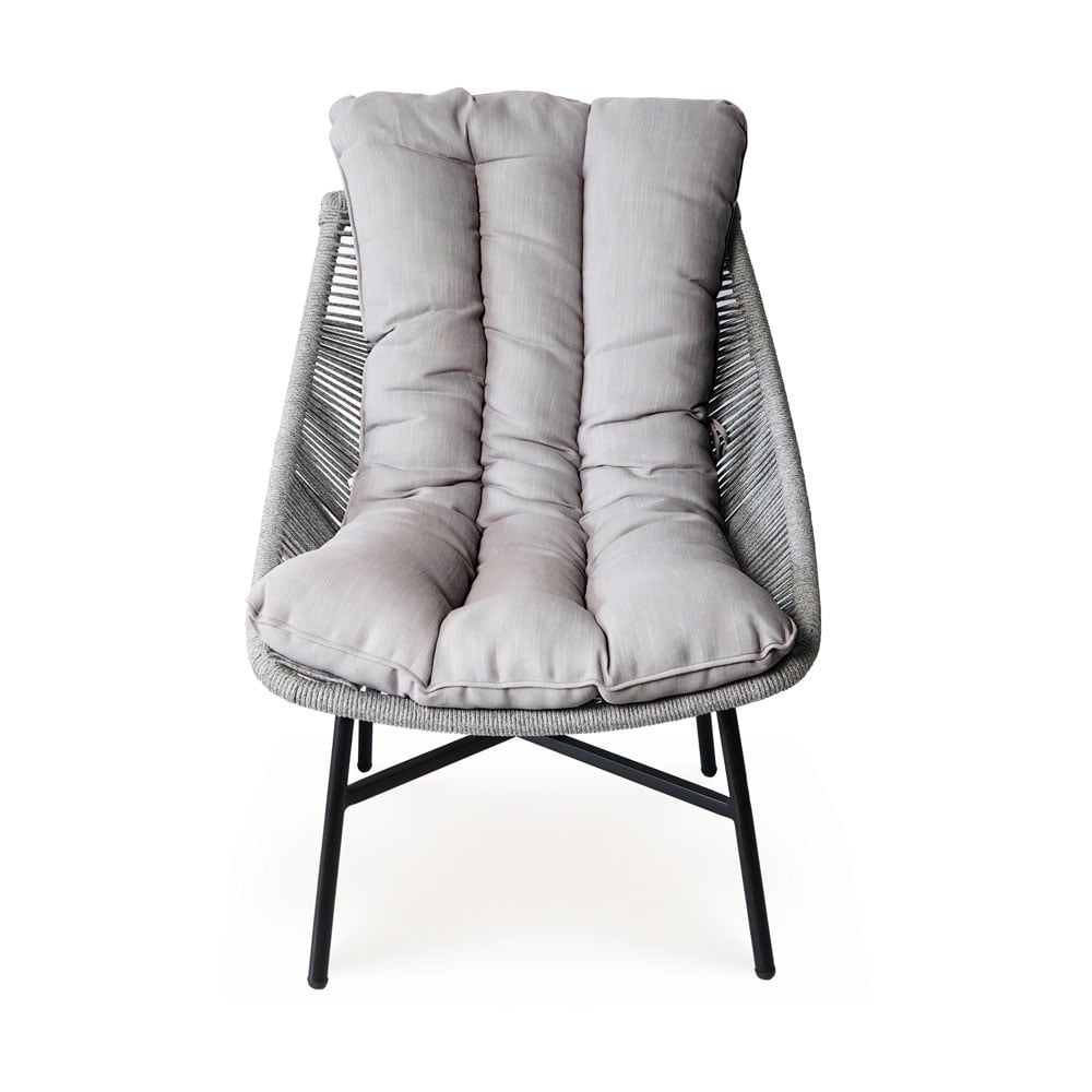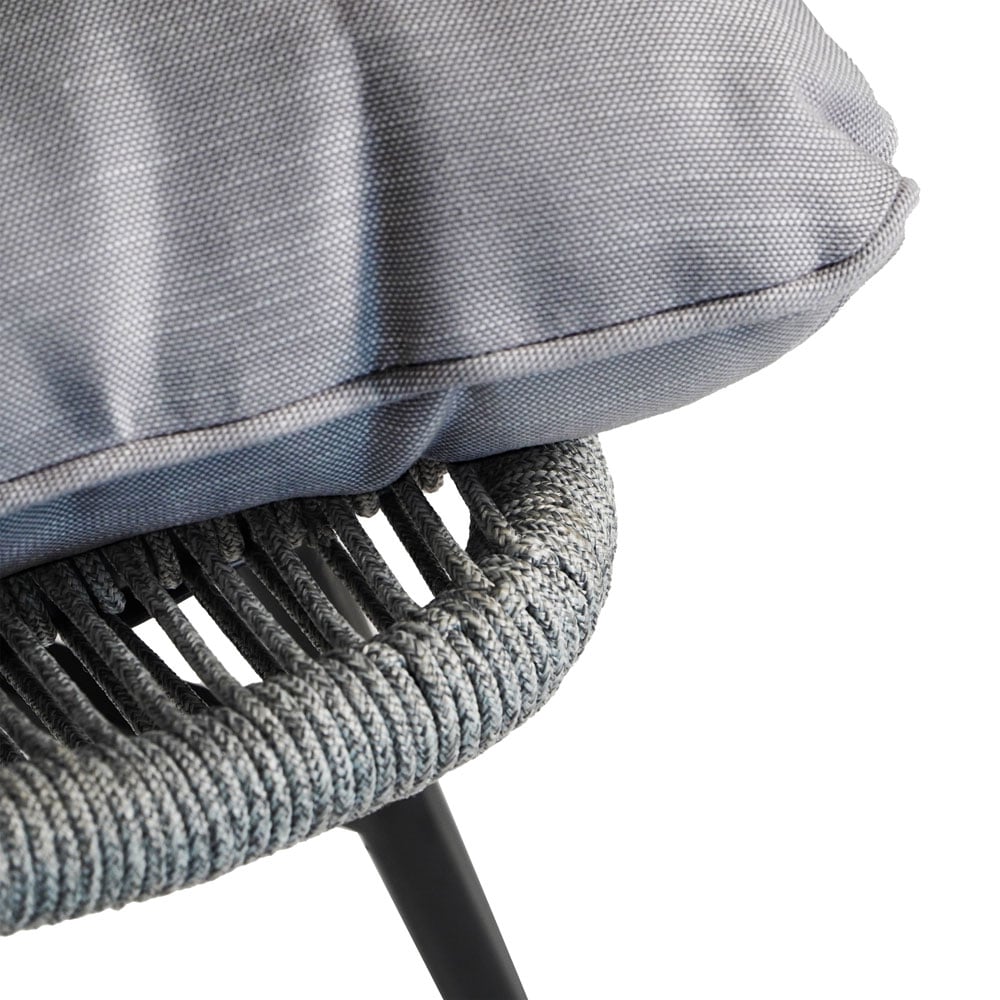 The sturdy black powder-coated steel frame provides long-lasting strength and resistance to outdoor conditions, while the round light-grey rope weaving adds breathable comfort and visual texture. Thick seat cushions with fiber filling and durable polyspun fabric enhance relaxation and are suitable for outdoor use.
