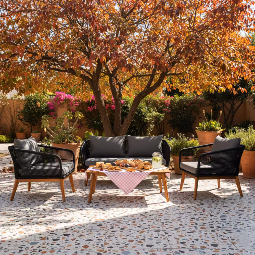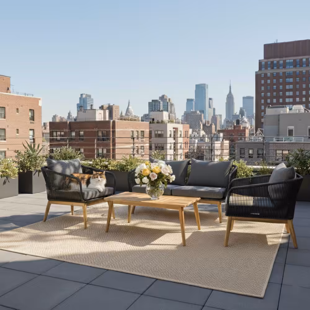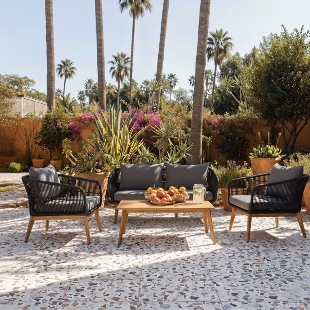 The clean combination of steel framing, elegant rope weaving, and warm acacia wood creates a look that feels both contemporary and naturally inviting—perfect for patios, gardens, balconies, or quiet courtyard corners. Whether you’re enjoying morning coffee, hosting close friends, or simply unwinding after a long day, this set turns any outdoor space into a place people love to gather.