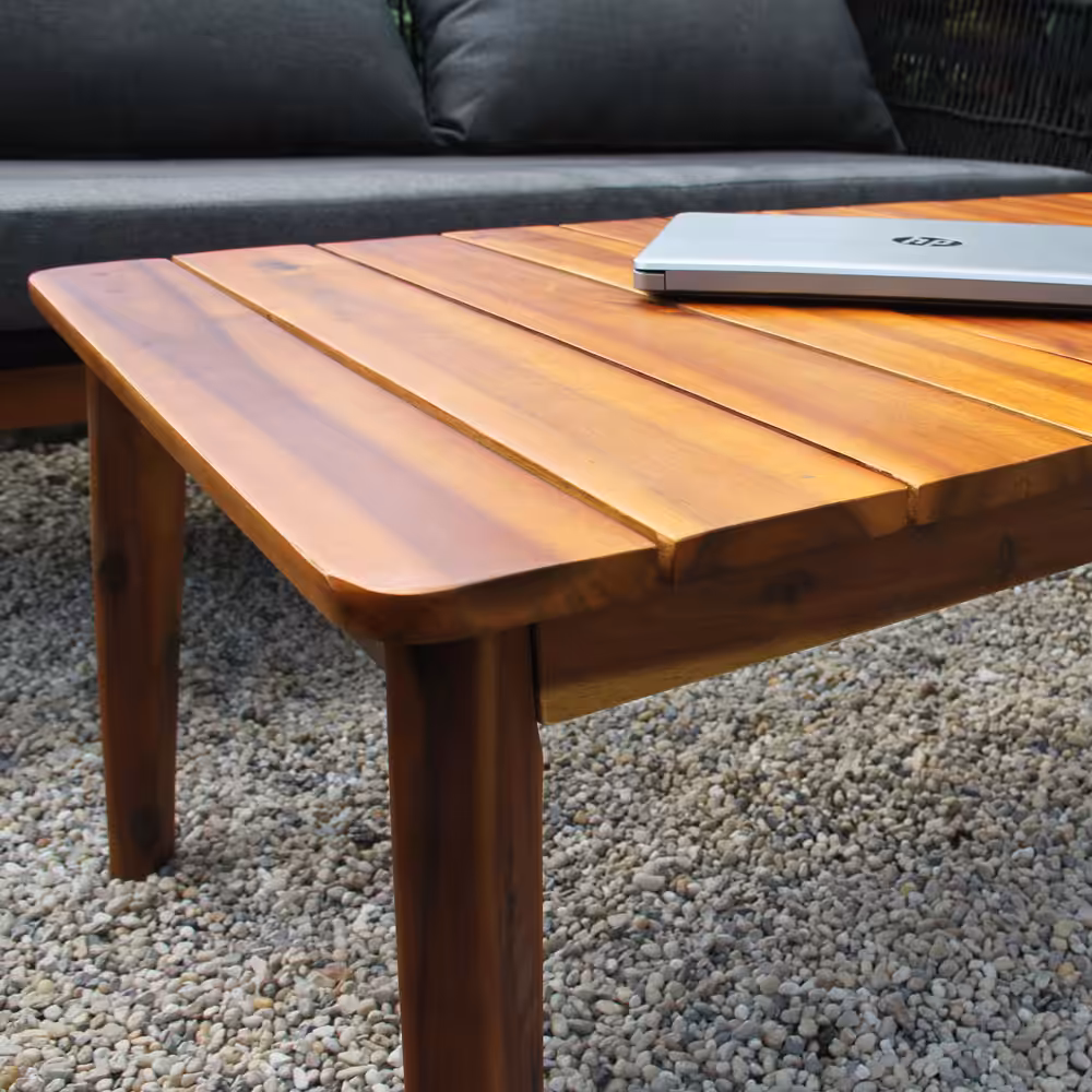 At the center, the acacia wood tabletop adds warmth and durability, offering a natural surface for drinks, books, or light meals outdoors.