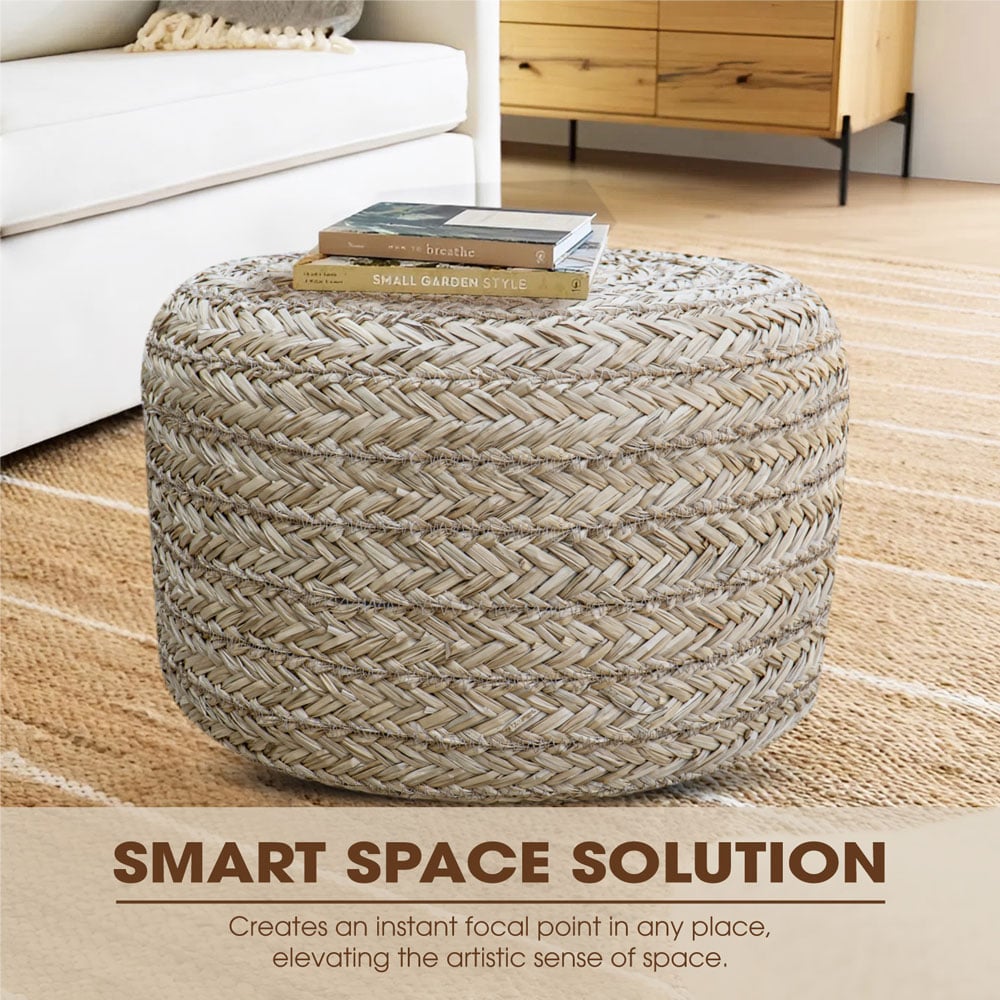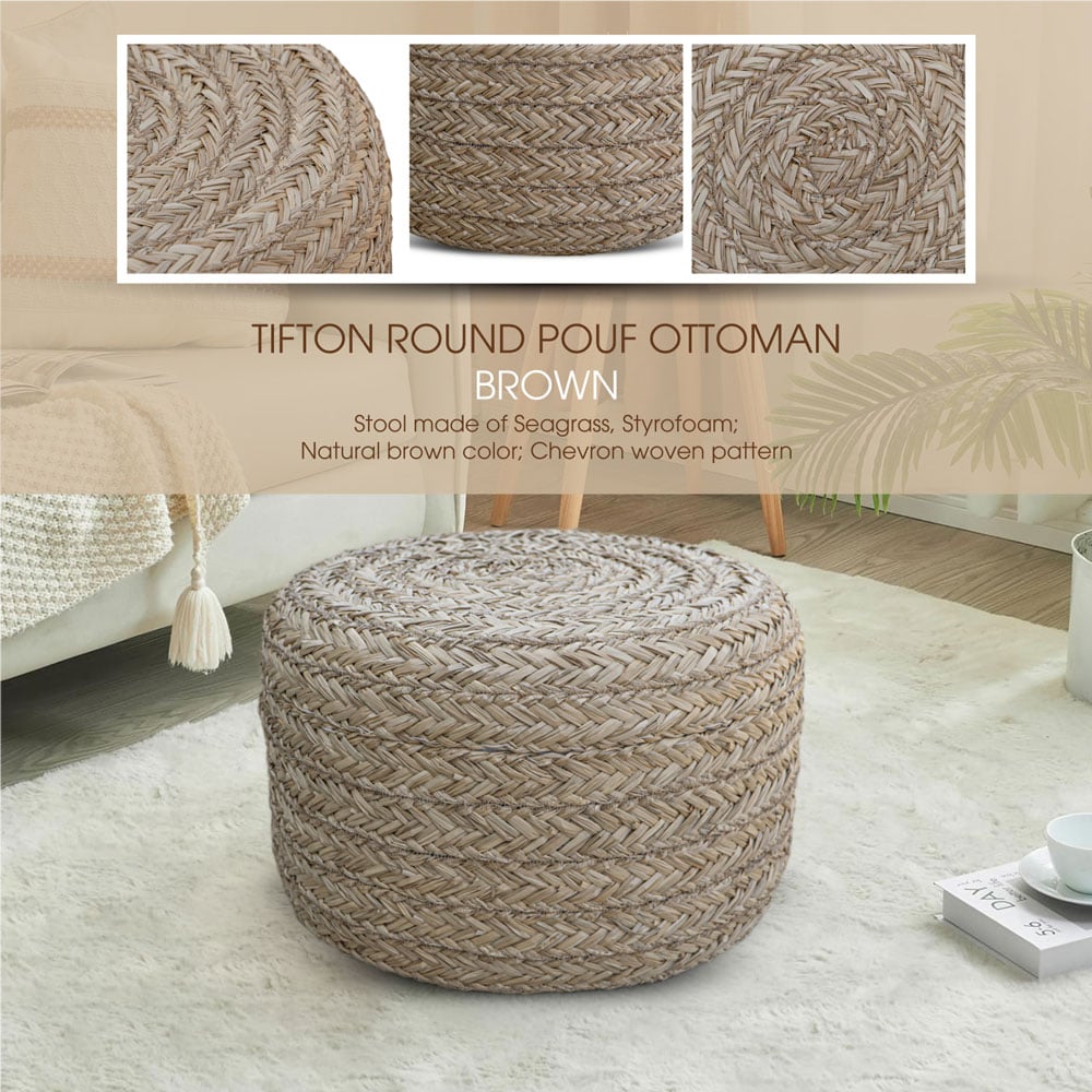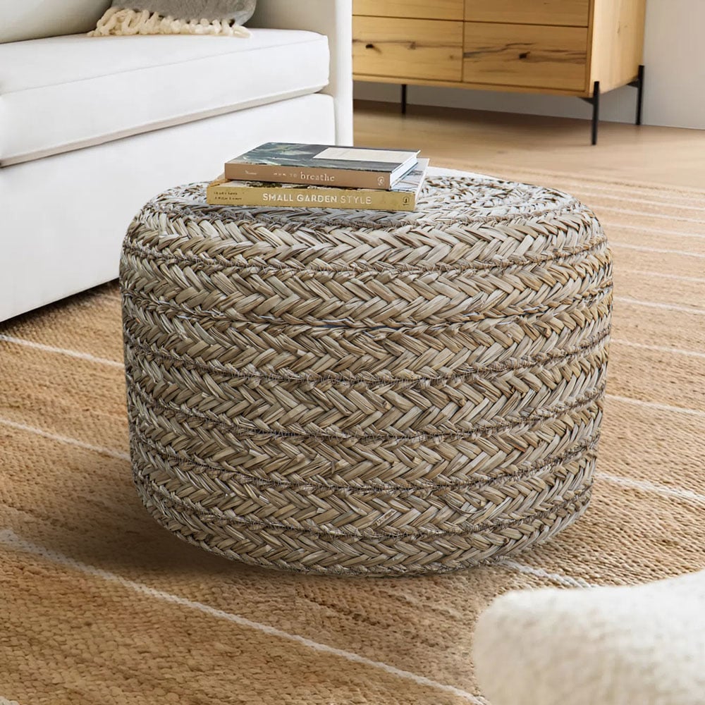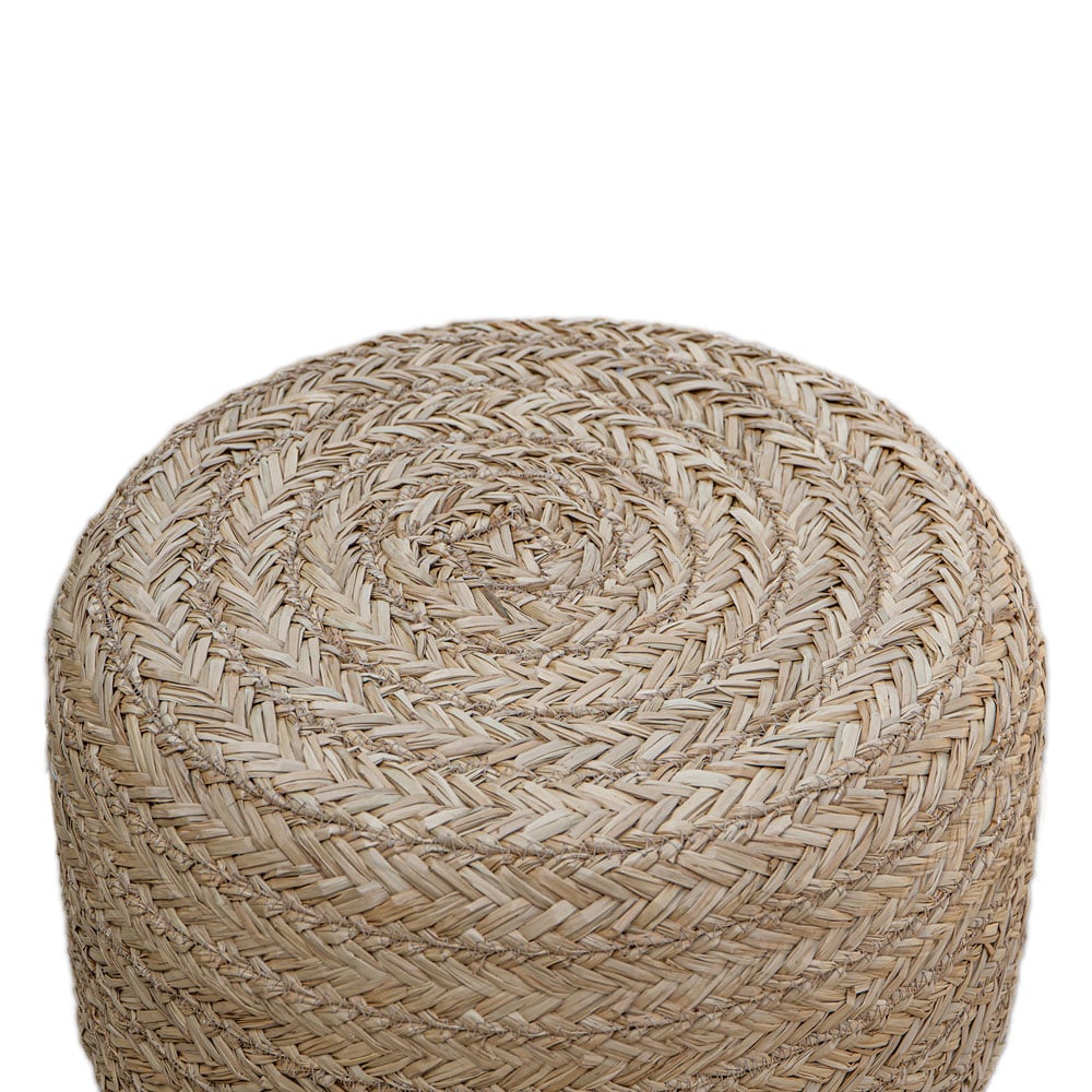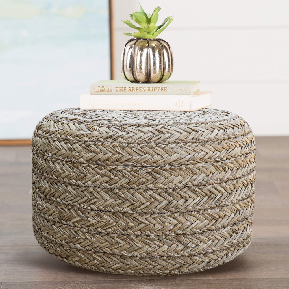 Bring warmth, texture, and organic beauty into your living space with this handcrafted Natural Seagrass Chevron Accent Stool. Expertly woven from durable natural seagrass over a supportive styrofoam core, this round ottoman delivers both comfort and long-lasting structure while maintaining a lightweight design that’s easy to move throughout your home.