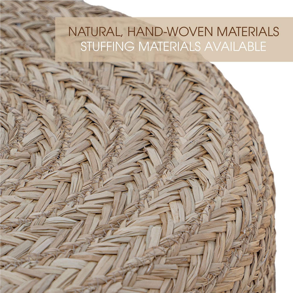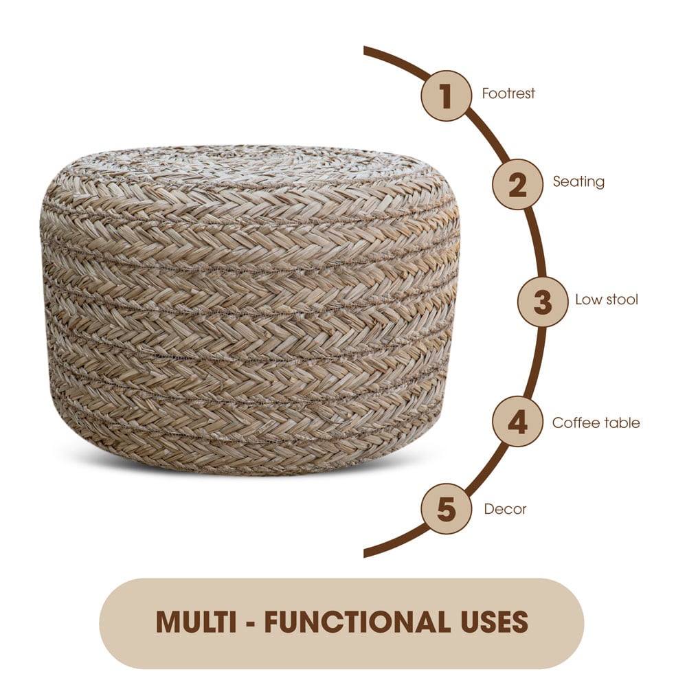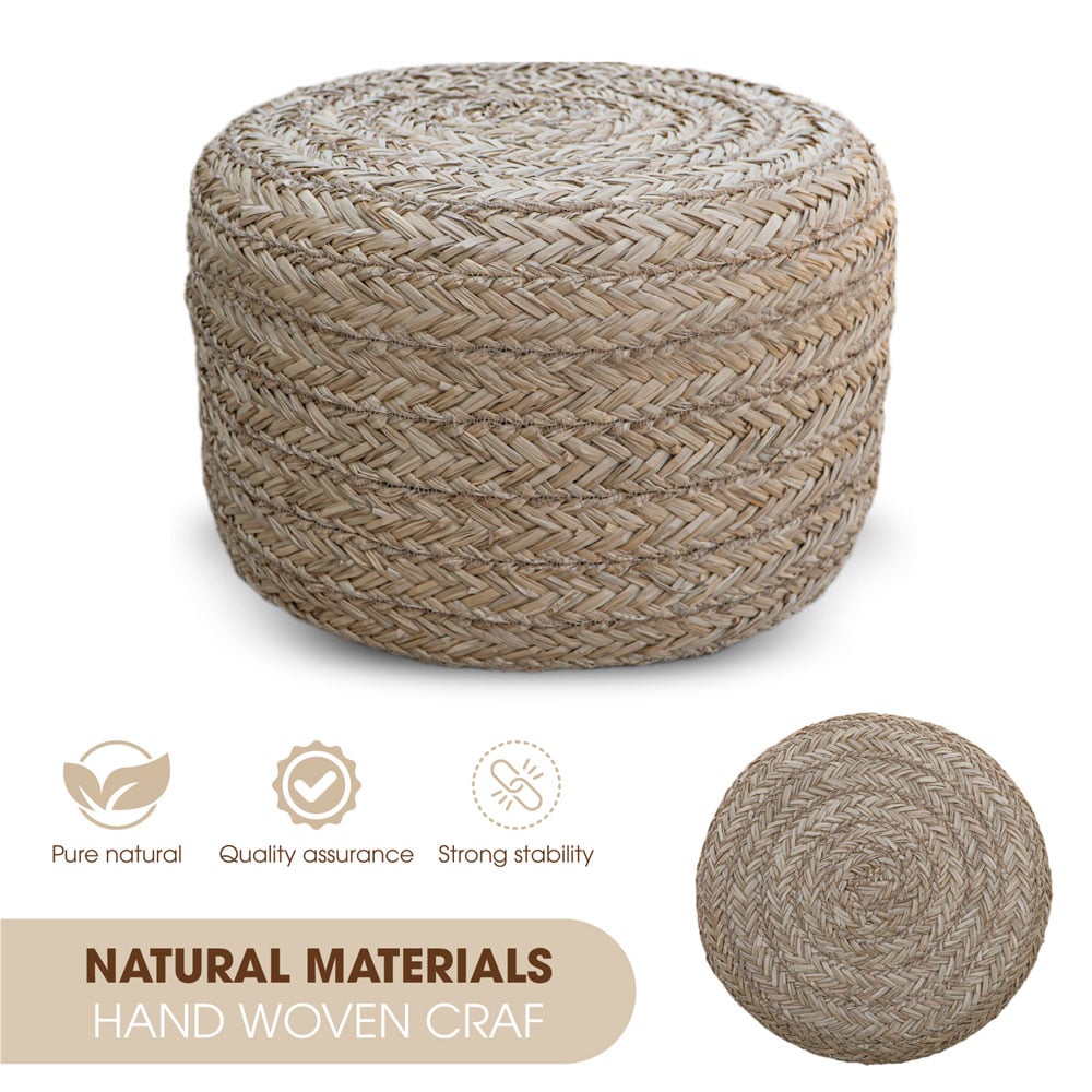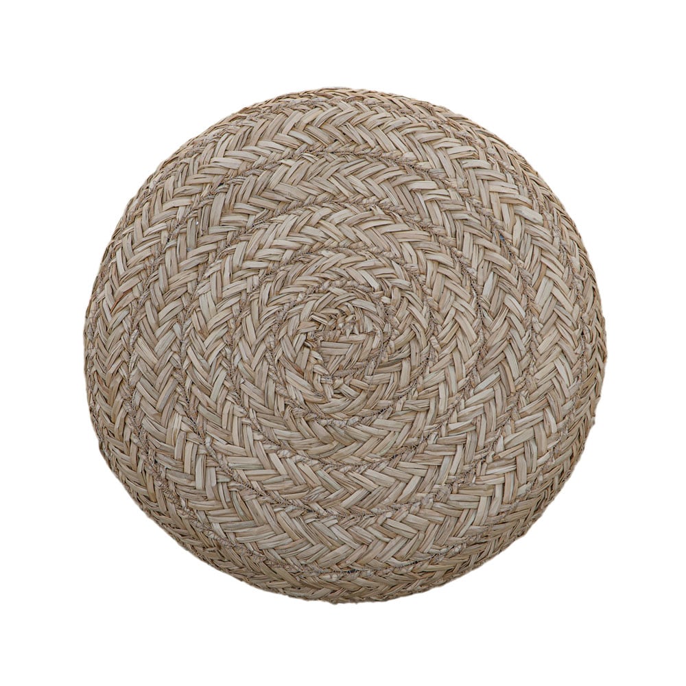 Bring warmth, texture, and organic beauty into your living space with this handcrafted Natural Seagrass Chevron Accent Stool. Expertly woven from durable natural seagrass over a supportive styrofoam core, this round ottoman delivers both comfort and long-lasting structure while maintaining a lightweight design that’s easy to move throughout your home.