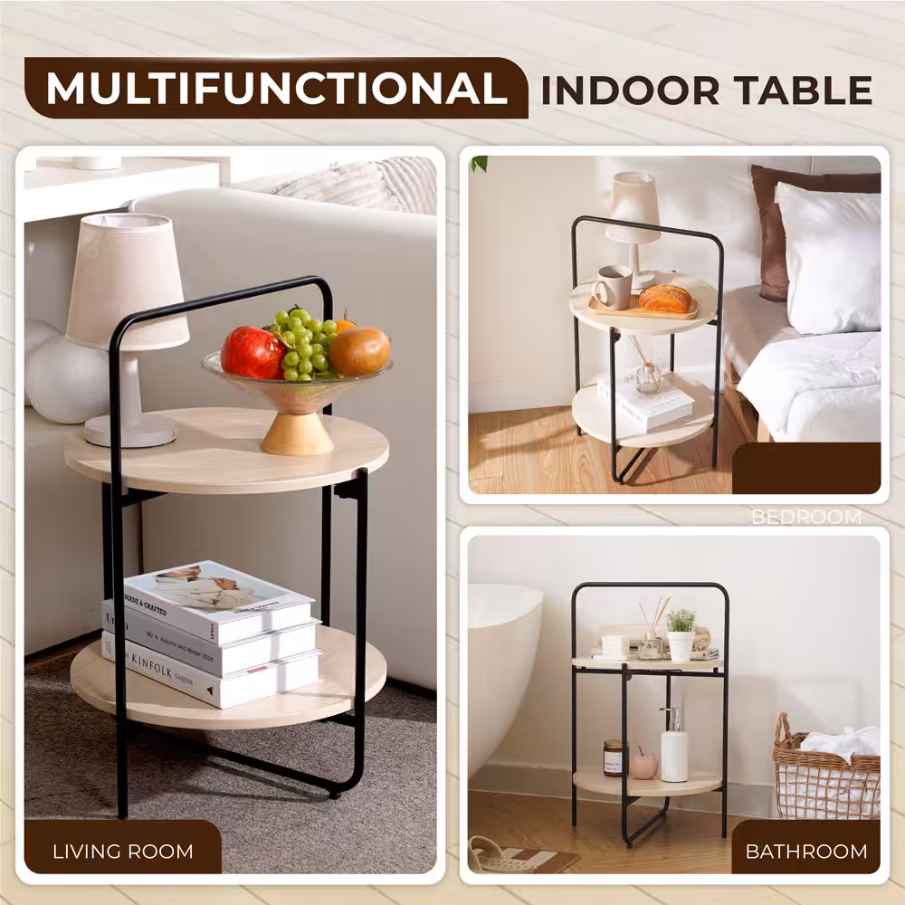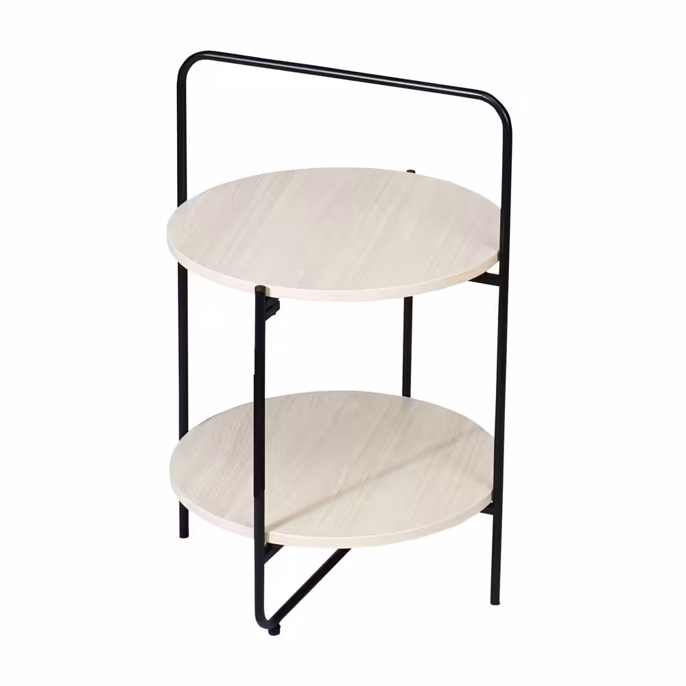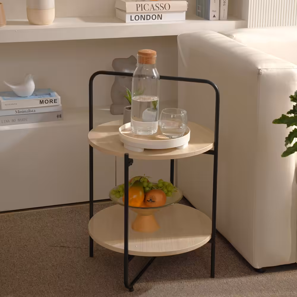 Upgrade your living space with this modern round end and side table, designed with a sturdy foldable steel frame and smooth MDF shelving for everyday convenience. The two-tier circular design provides practical storage for books, décor, or bedside essentials while maintaining a clean, minimalist appearance that blends effortlessly into contemporary, Scandinavian, or modern interiors.