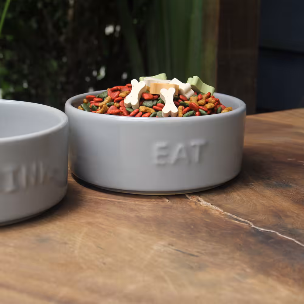 Set of 2 Stoneware Pet Bowls for Cats & Small Dogs – Gray Cute Text High-Gloss Easy-Clean Pet Dish