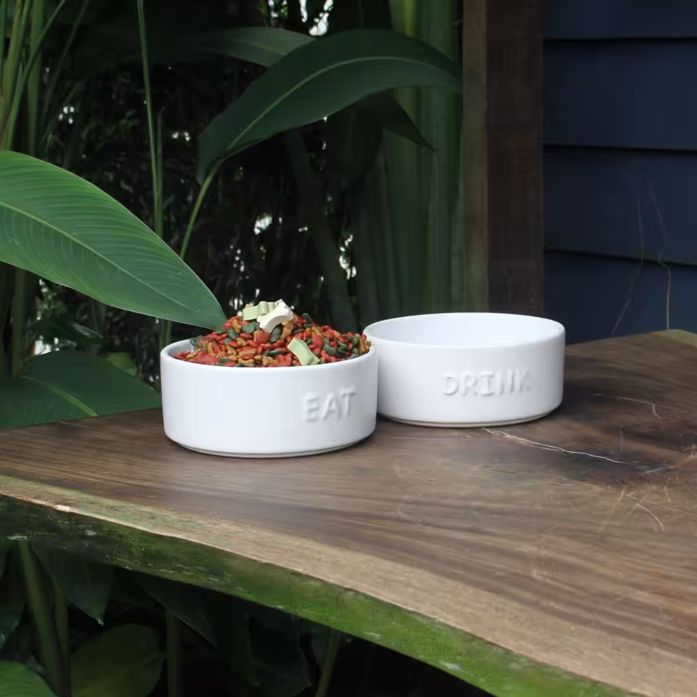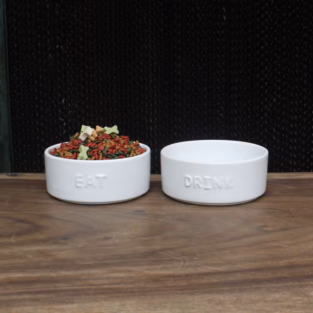 Set of 2 Stoneware Pet Bowls for Cats & Small Dogs – White Cute Text High-Gloss Easy-Clean Pet Dish