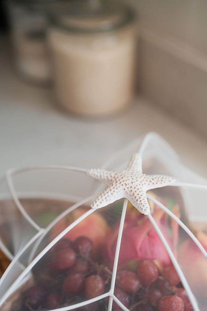 Introducing our Starry Night Serving Seagrass Tray with Mesh Cover! It’s a cool way to serve and protect your yummy food. The tray has a fancy star design that makes it look really nice on your table. It’s made of strong materials, so it will last a long time. The white mesh food cover is super handy.