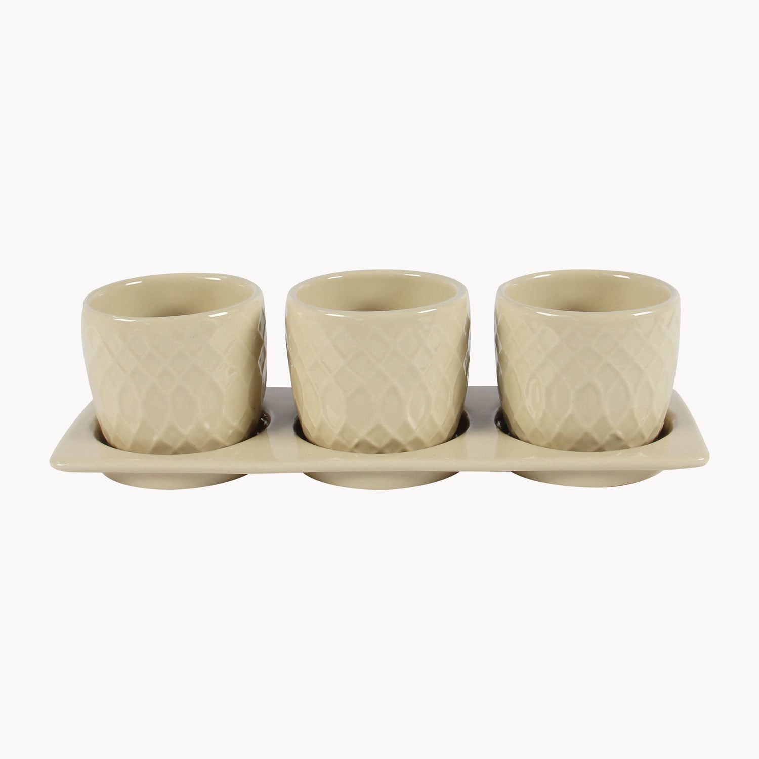 Stoneware Indoor Planter Set with Tray – Criss-Cross Pattern Modern Decorative Pots (Set of 3)