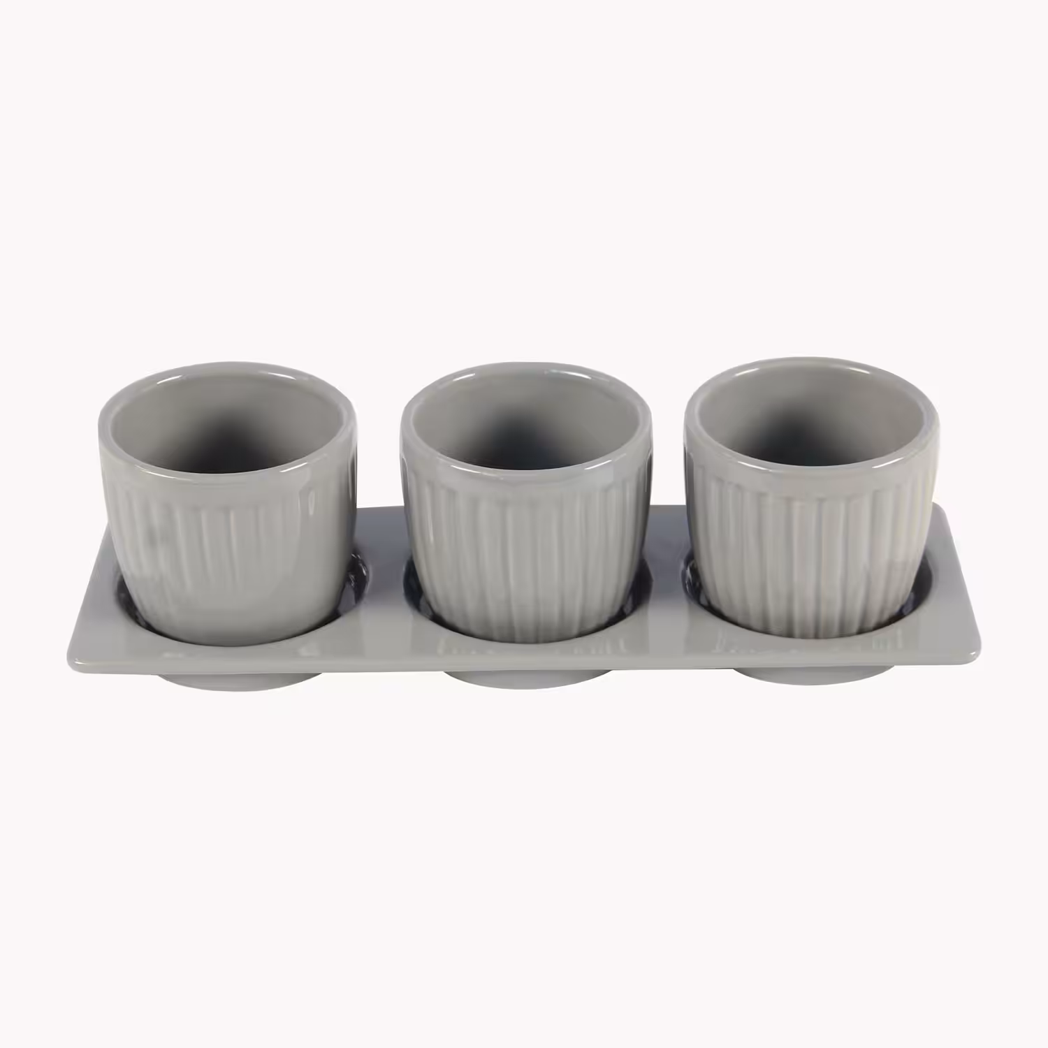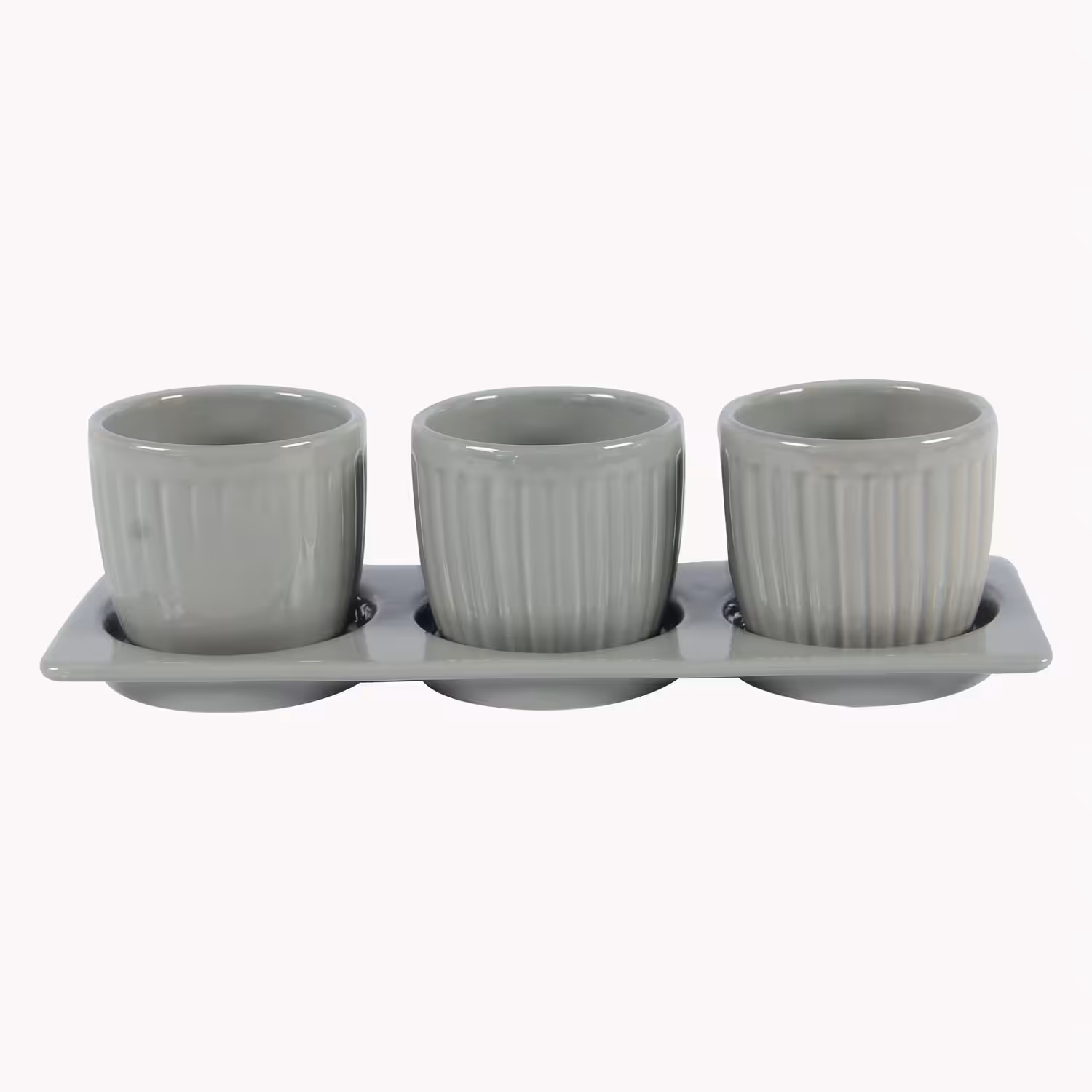 Stoneware Indoor Planter Set with Tray – Embossed Stripe Texture, Drainage Holes, Modern Decorative Pots (Set of 3)