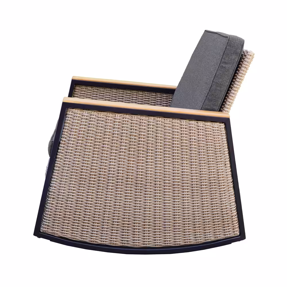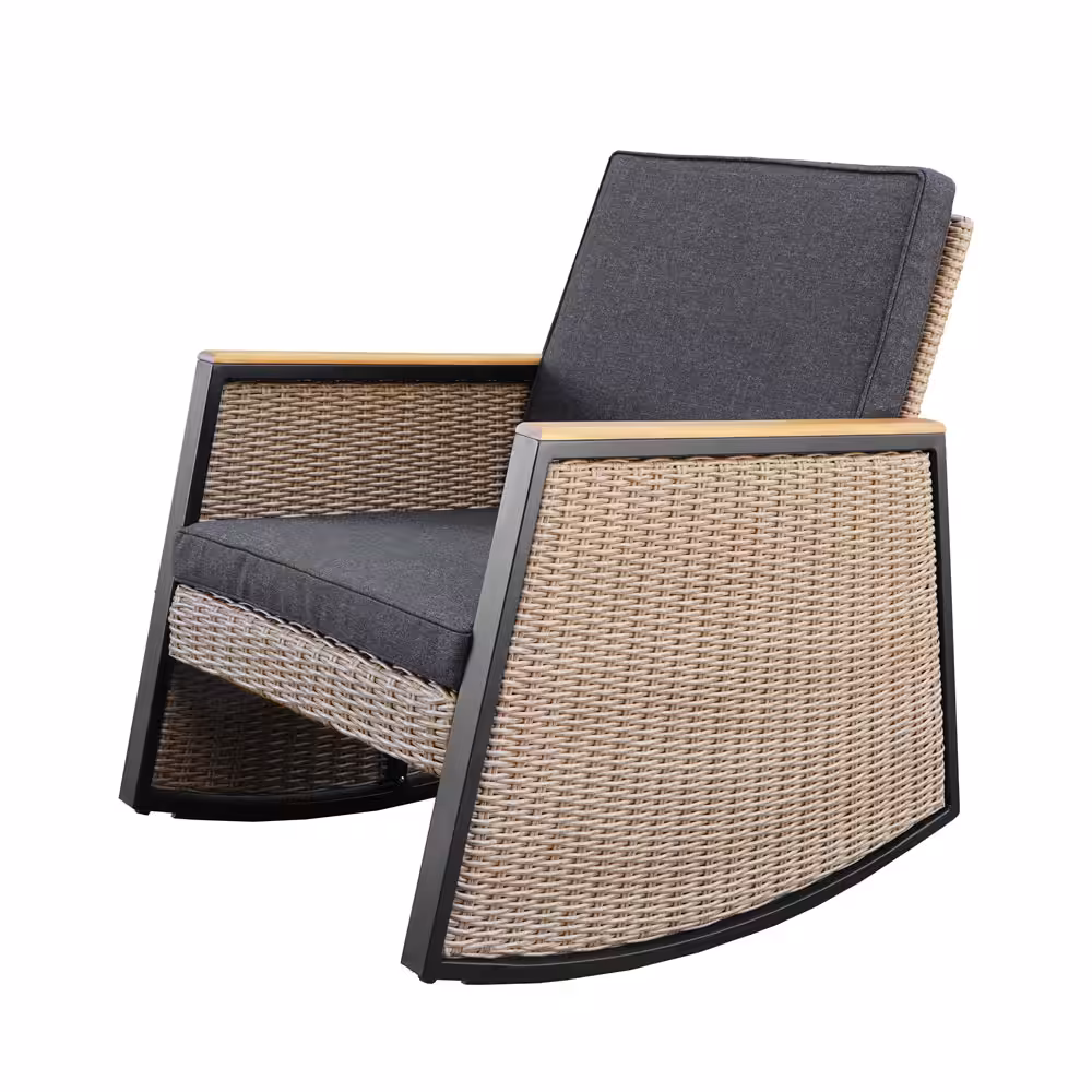 The combination of black powder-coated steel, brown half-round wicker weaving, and acacia wood accents brings a balanced look that feels both contemporary and inviting—perfect for balconies, patios, garden paths, or cozy indoor-outdoor spaces.